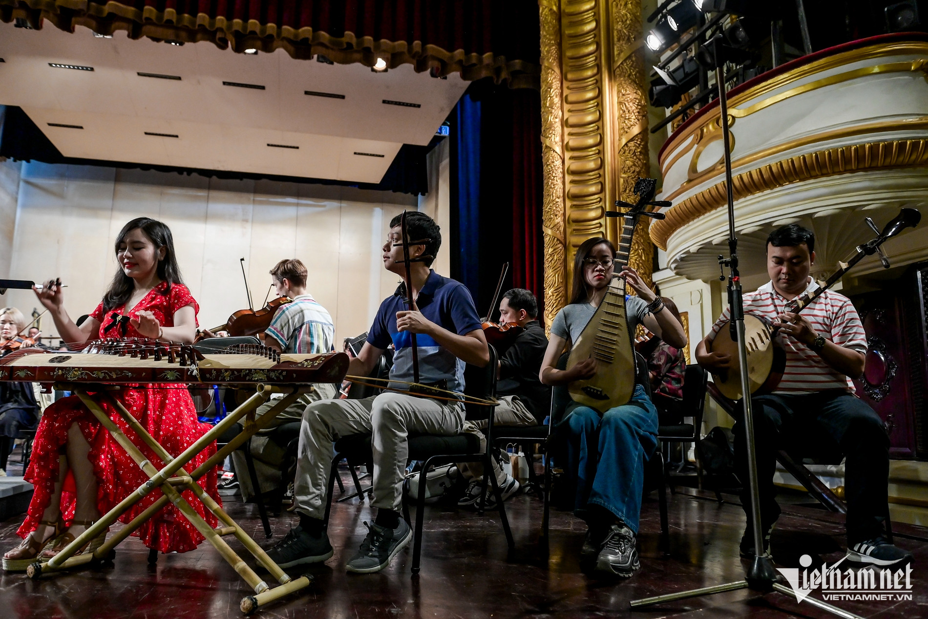 Dinh Trang en Hoang Ke en het Sun Symphony Orchestra oefenen nog steeds Thei Mai , een werk dat Vietnamese volksmuziek en moderne symfonische stijl op soepele wijze combineert.