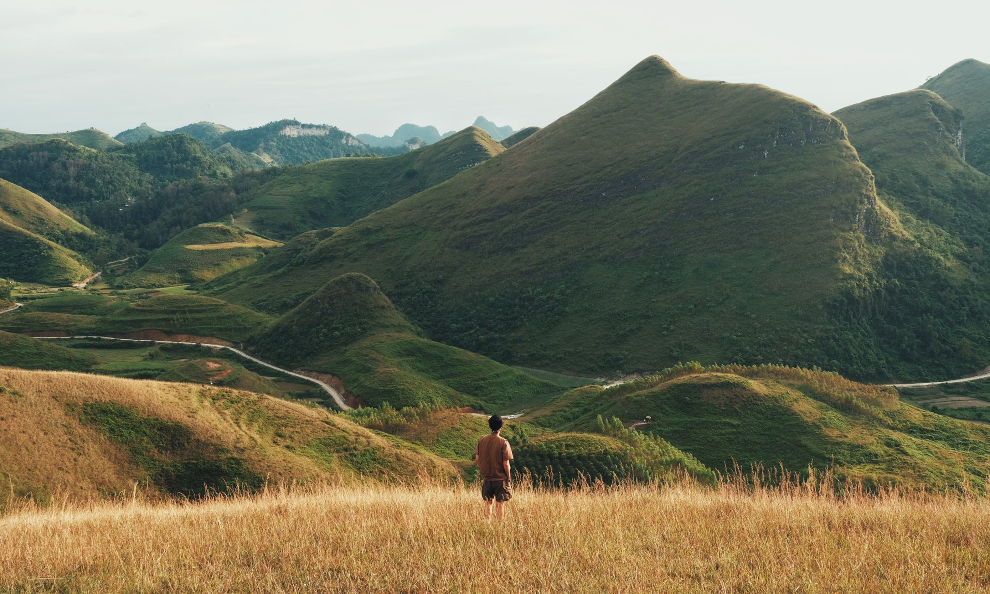 Hoe hoger je komt, hoe opener de ruimte wordt. Voor je ogen verschijnt een felgeel grasveld dat zich tussen donkergroene bergen slingert.