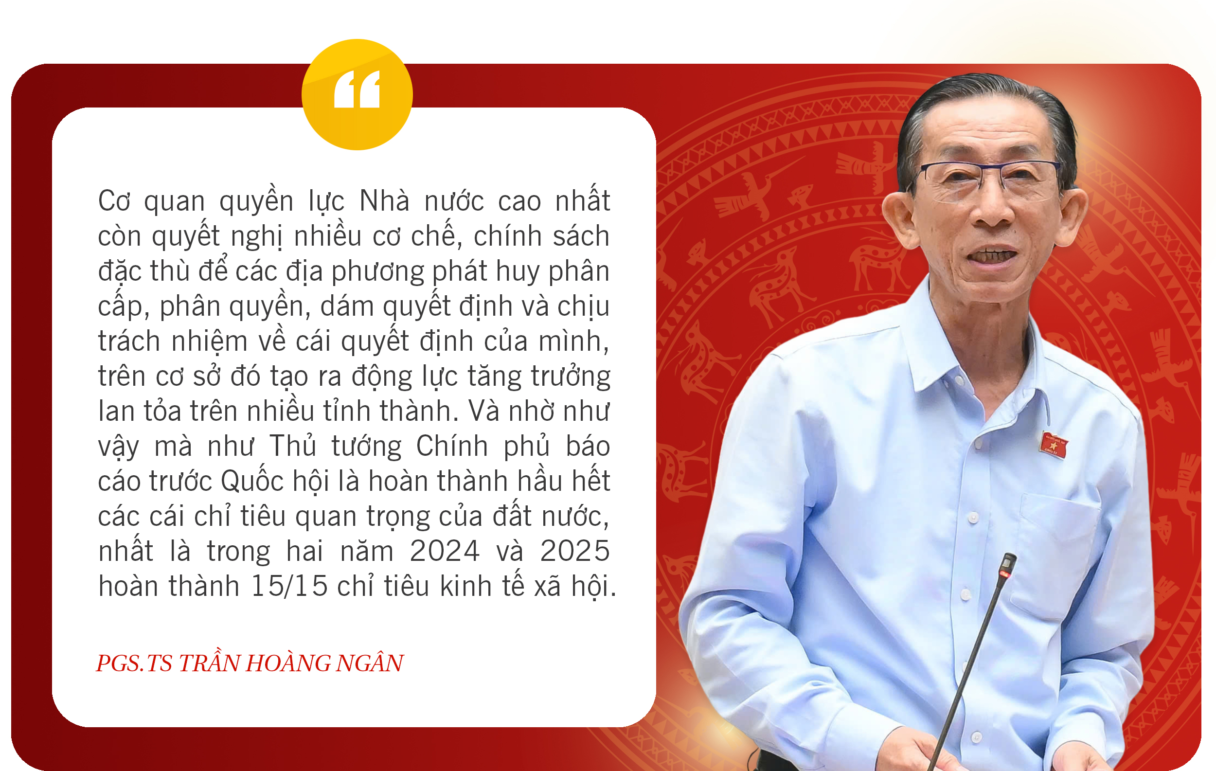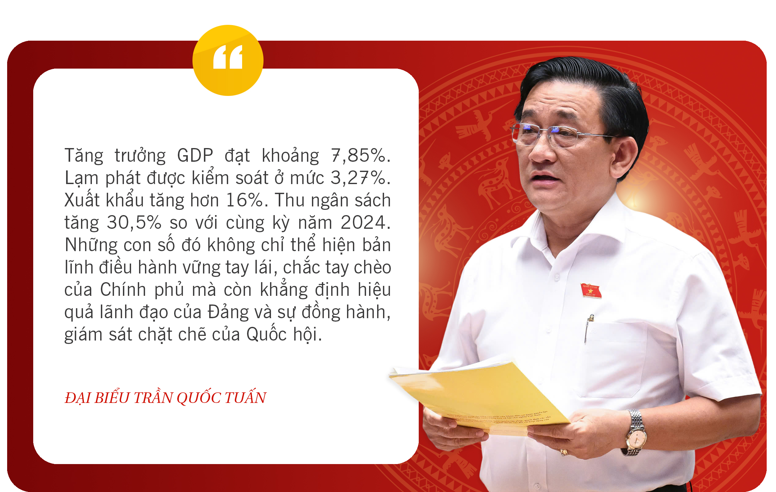 "De bbp-groei bereikte ongeveer 7,85%. De inflatie werd onder controle gehouden op 3,27%. De export steeg met meer dan 16%. De begrotingsinkomsten stegen met 30,5% ten opzichte van dezelfde periode in 2024. Deze cijfers tonen niet alleen het standvastige leiderschap van de regering aan, maar bevestigen ook het leiderschap van de partij en de nauwe steun en het toezicht van de Nationale Assemblee", aldus de heer Tran Quoc Tuan.