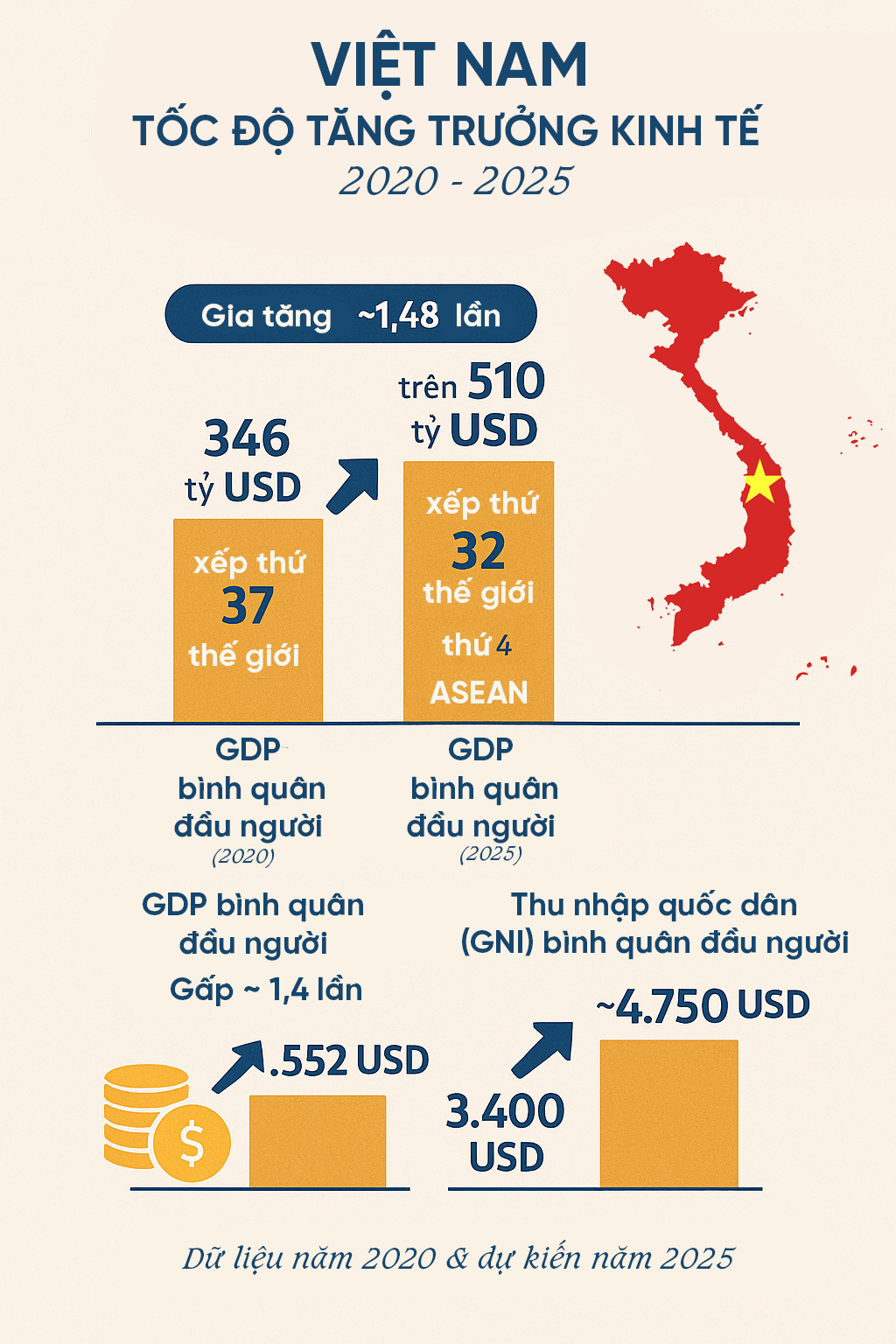 De gemiddelde groei in de periode 2021-2025 bedroeg ongeveer 6,3%, hoewel de doelstelling van 6,5% tot 7% niet werd gehaald. Het is echter een prijzenswaardig resultaat gezien de vele schommelingen in de wereld. De economische omvang bereikte meer dan 510 miljard dollar, een stijging van bijna 1,5 keer ten opzichte van 2020. Het bbp per hoofd van de bevolking bedroeg ongeveer 5.000 dollar, waarmee Vietnam tot de groep landen met een hoog gemiddeld inkomen behoort. De inflatie werd onder controle gehouden rond de 3%. De staatsschuld bleef gehandhaafd op 35% tot 36%, wat de nationale financiële zekerheid waarborgde.