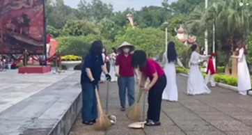 Ambtenaren en medewerkers van de Administratieve Afdeling voeren landschapsbehoudwerkzaamheden uit in het Ho Chi Minh Museum. Foto: BTHCM