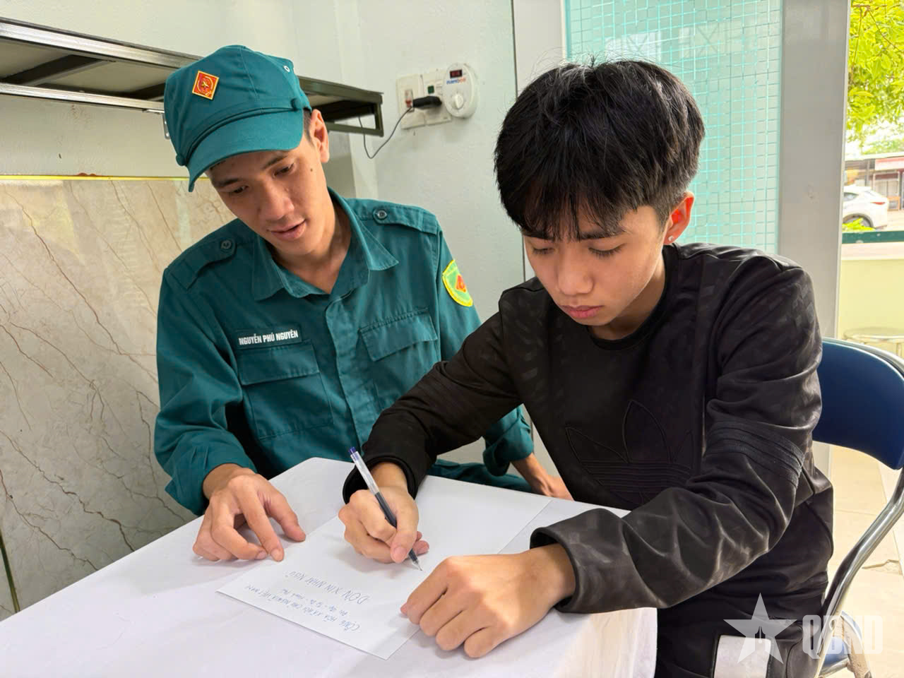 Ambtenaren van het militaire commando van de wijk Hoa Khanh begeleiden jongeren bij het schrijven van sollicitaties voor militaire dienst. |
