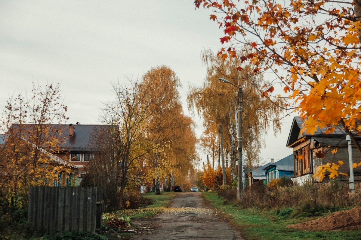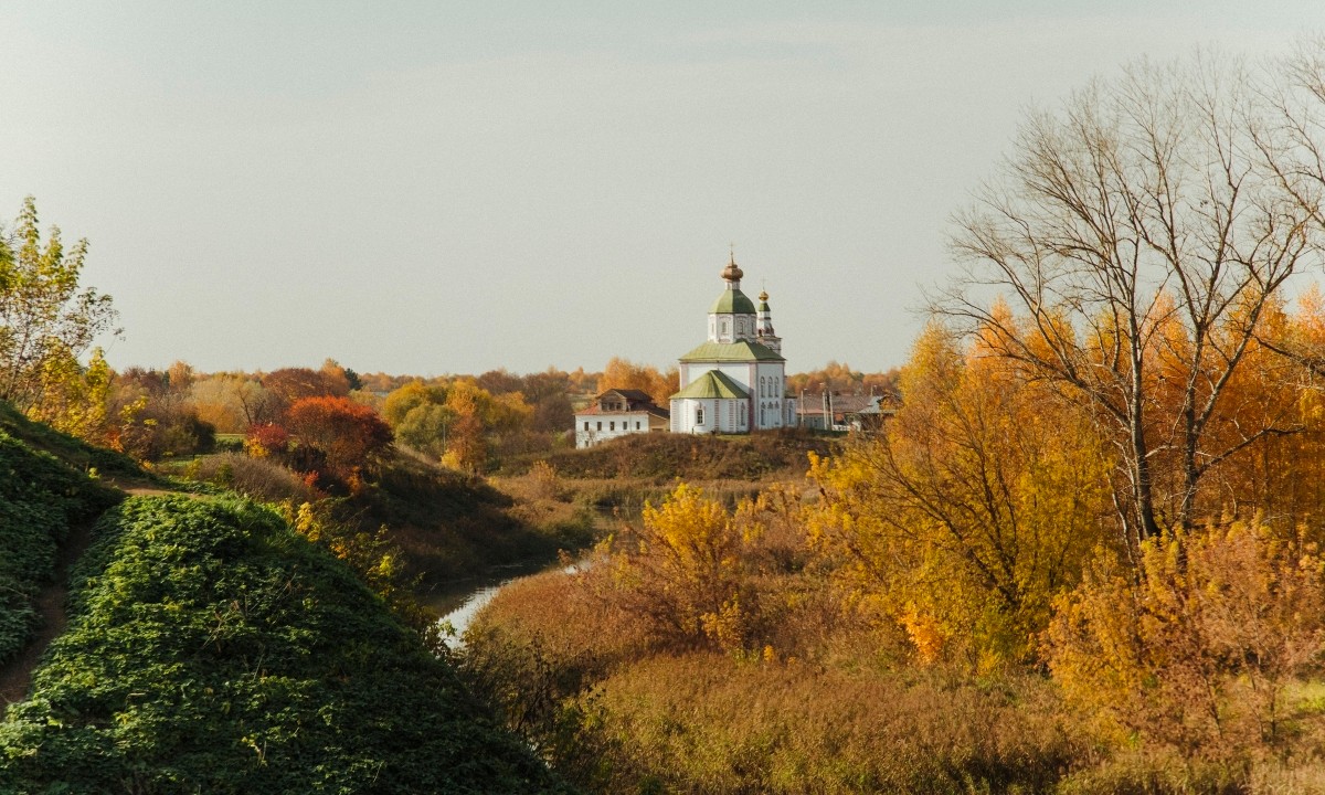 In de herfst is het rustig in Soezdal. De traditionele houten huizen en kerkklokken klinken door het landschap.