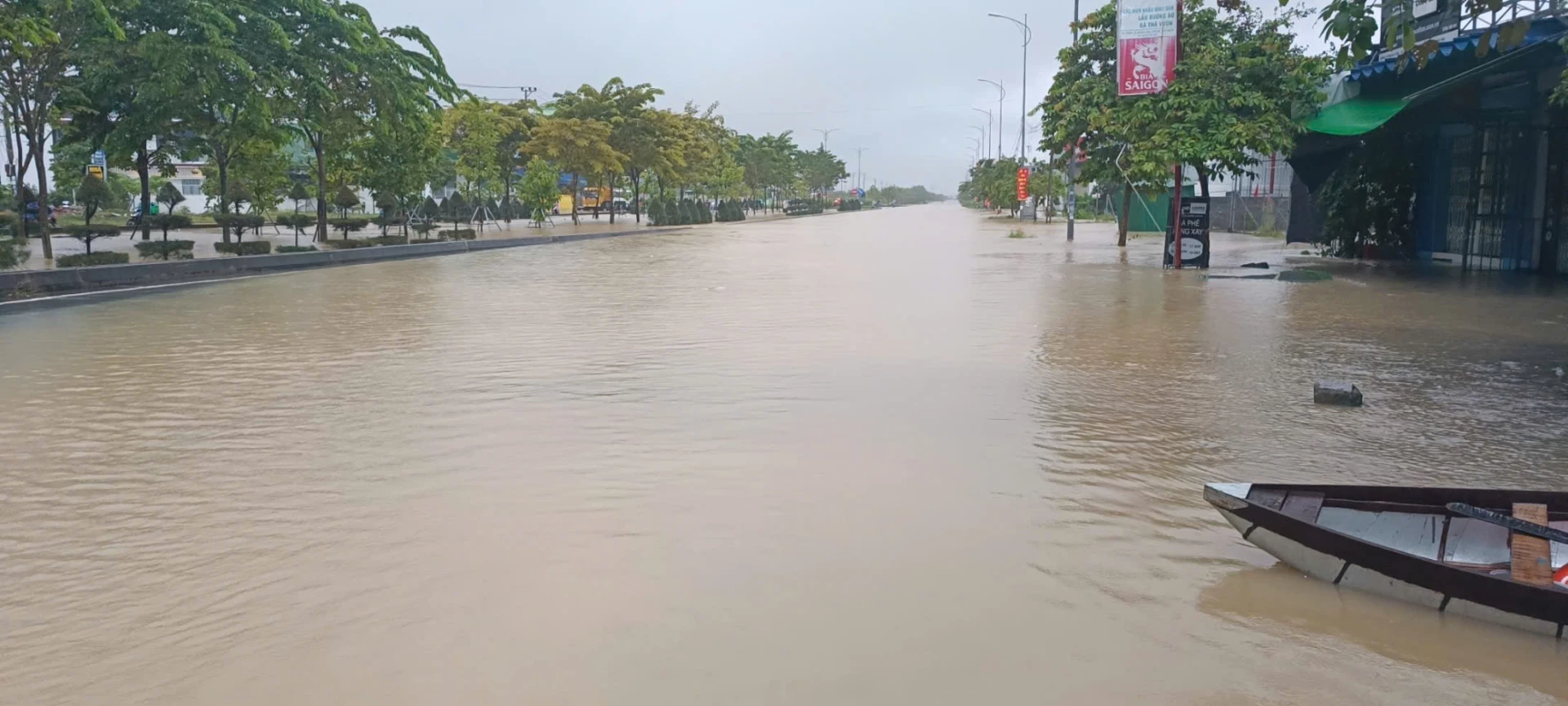 | De Vo Nguyen Giap-straat (dorpsdeel Vo Kien) staat onder water, waardoor het verkeer moeilijk is. |