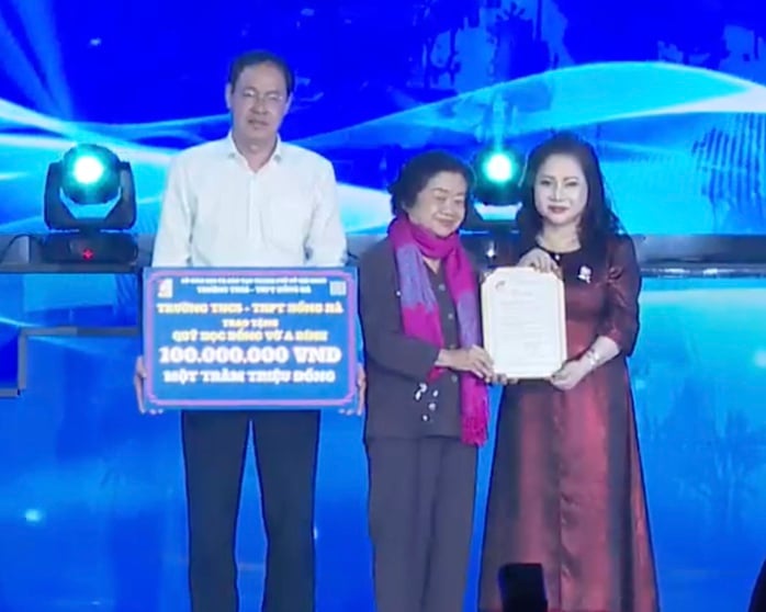 Mevrouw Truong My Hoa, voormalig vicepresident van de Socialistische Republiek Vietnam en voorzitter van het Vu A Dinh Scholarship Fund, en de heer Nguyen Thanh Trung, vicevoorzitter van het Vietnamese Vaderlandsfrontcomité van Ho Chi Minhstad en voorzitter van de Ho Chi Minhstadse Boerenvereniging, ontvingen 100 miljoen VND, gedoneerd door de Hong Ha Secondary and High School aan het Vu A Dinh Scholarship Fund.