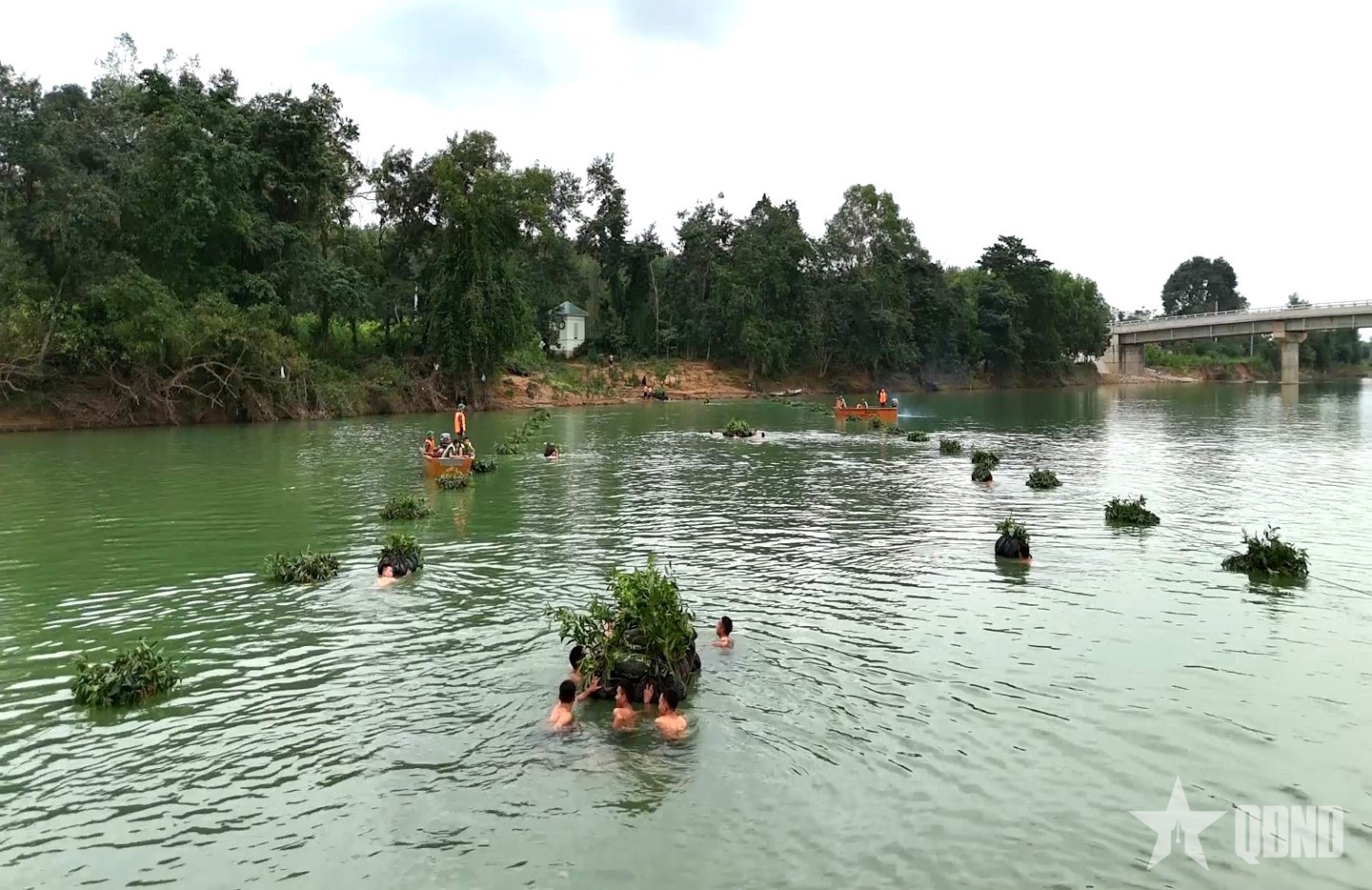 Officieren en soldaten van Bataljon 4 en brandweerploegen van Regiment 19, Divisie 968 organiseerden tijdens de oefening een rivieroversteek. |