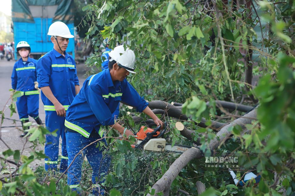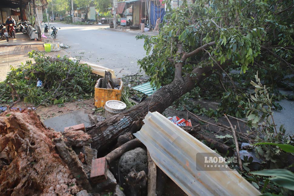 "Sinds 4 uur vanochtend is de hele politiemacht aanwezig in de wijken, in samenwerking met de reddingsdienst en het bomenbedrijf om omgevallen bomen te kappen en verkeersroutes vrij te maken. Er zijn geen gewonden of doden gevallen in het gebied; 3 huizen zijn ingestort en 89 huizen hebben hun daken eraf geblazen", aldus mevrouw Hoa. Foto: Hoai Phuong