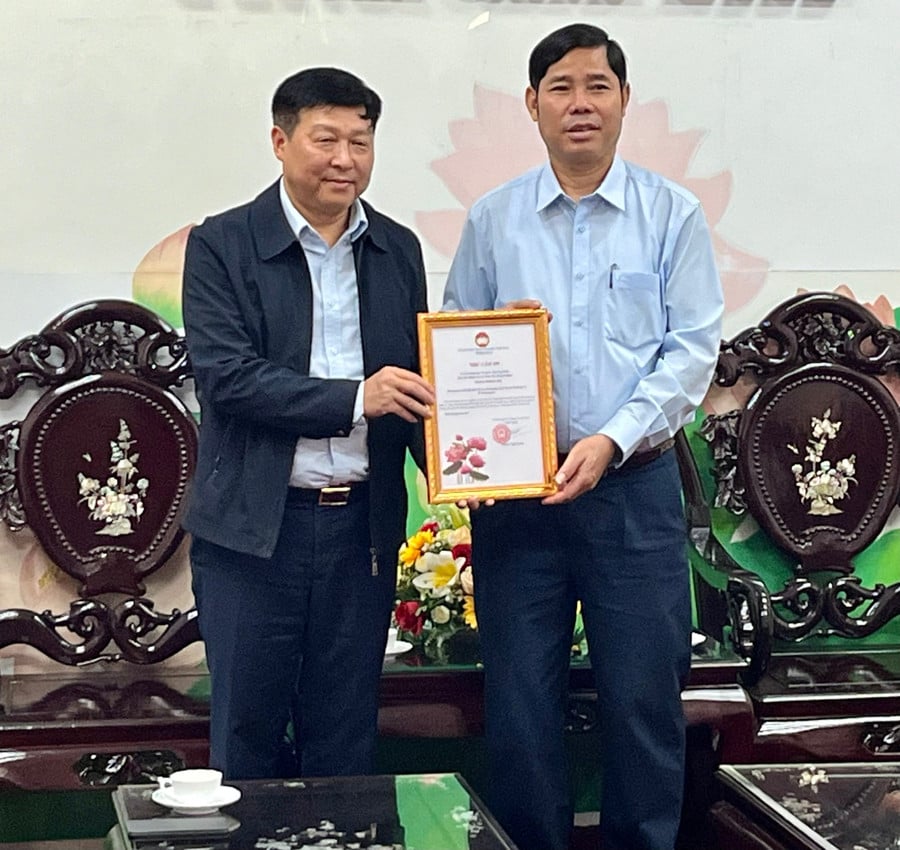Permanent vicevoorzitter van het Comité van het Vietnamese Vaderlandfront van de provincie Gia Lai. Tran Minh Son (rechts) overhandigt een bedankbrief aan het Comité van het Vietnamese Vaderlandfront van de stad Hanoi. Foto: Bao Long