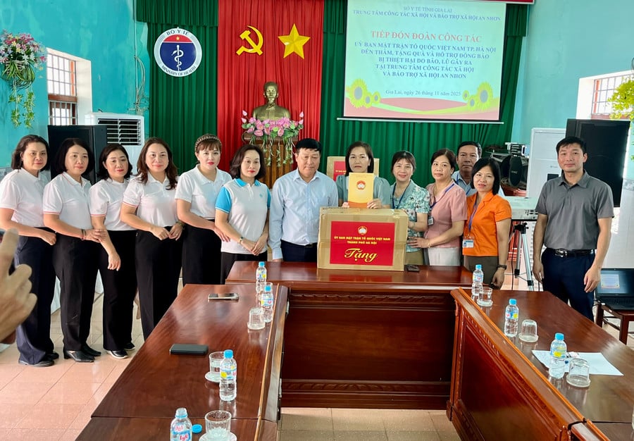 Ook op 26 november bracht een delegatie van het Vietnamese Vaderlandsfrontcomité in Hanoi een bezoek, waar ze 10 miljoen VND in contanten, 300 nieuwe kleren en vele andere benodigdheden overhandigden om het centrum voor maatschappelijk werk en sociale bescherming in An Nhon te ondersteunen bij de verwerking van de schade na de storm.