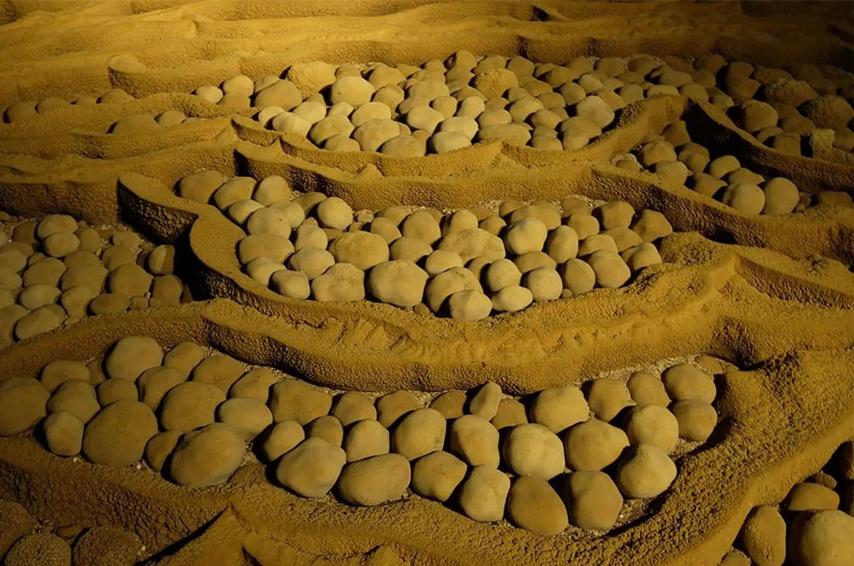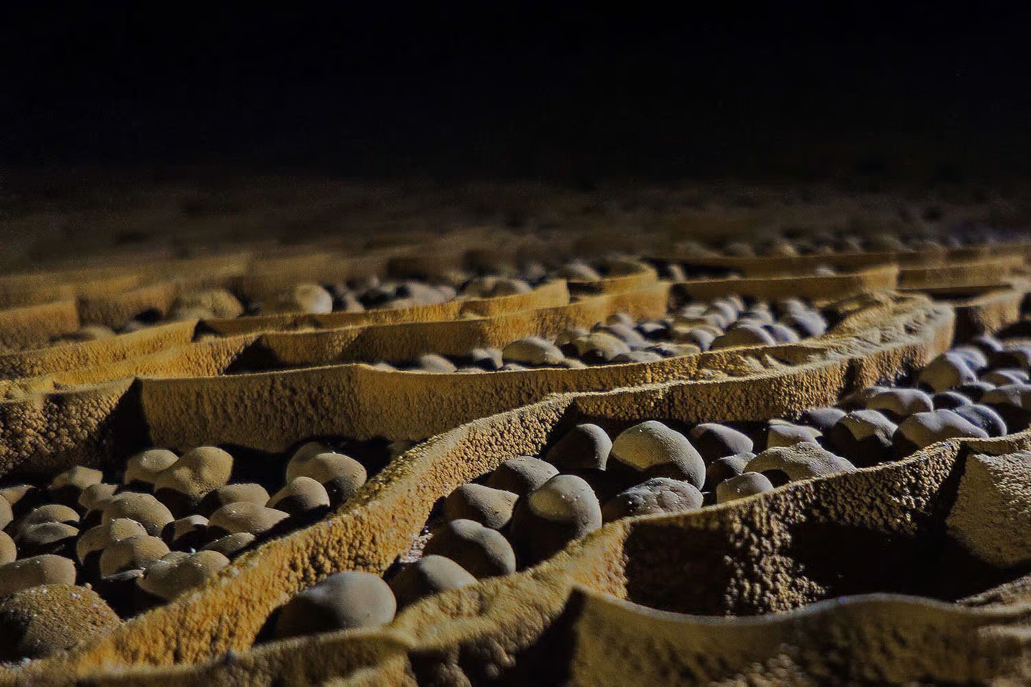 Huleperler er sfæriske steiner som varierer i størrelse fra en ert til en baseball. Ifølge forskere dannes huleperler når kalsittrikt vann renner ned fra huletaket og legger seg rundt sandkorn eller små gjenstander over en lengre periode. De dannes i vannpytter med høy konsentrasjon av kalsiumkarbonat. Dette gjør at store mengder kalsitt kan binde seg sammen på overflaten av perlen samtidig. (Foto: Oxalis Adventure).