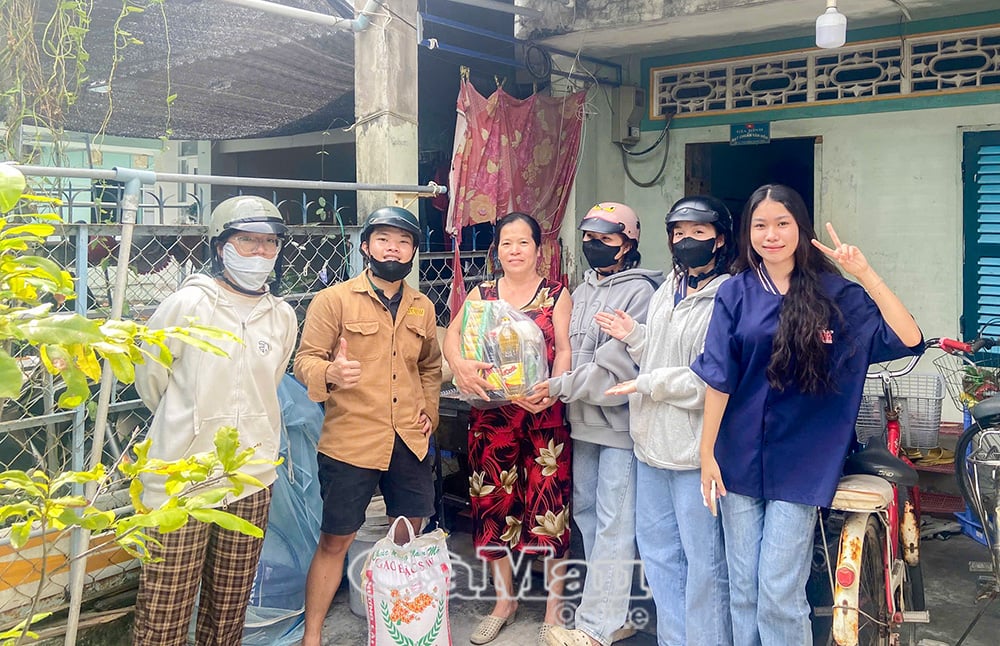 Bui Anh Ngoc (mørkeblå T-skjorte, høyre omslag) og vennene hennes i gruppen «Connecting Love» dro til hjemmene til fattige husholdninger i Ganh Hao kommune for å gi gaver.