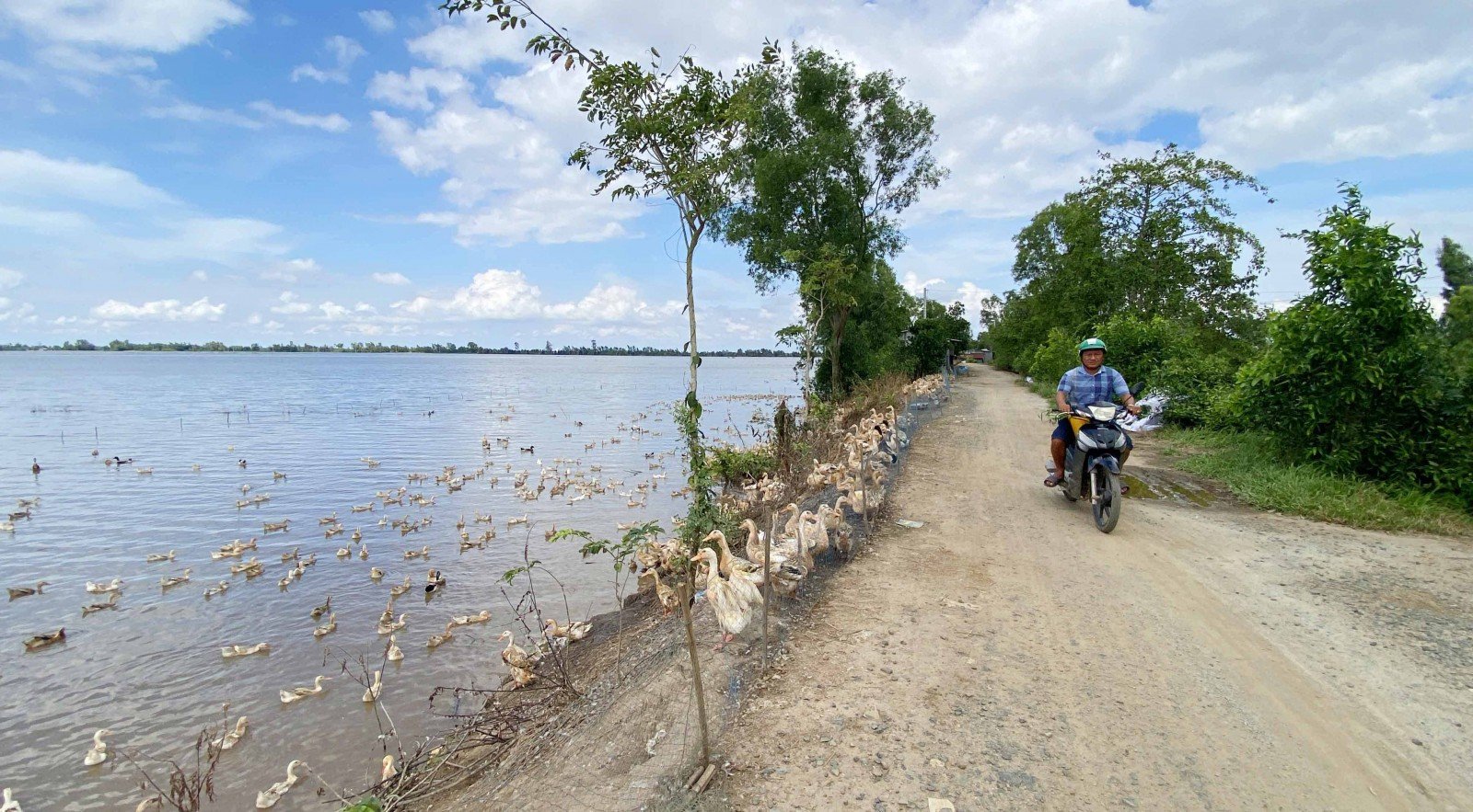 En flokk med ender på diket i Long Xuyen-firkantfeltet. Foto: THANH CHINH