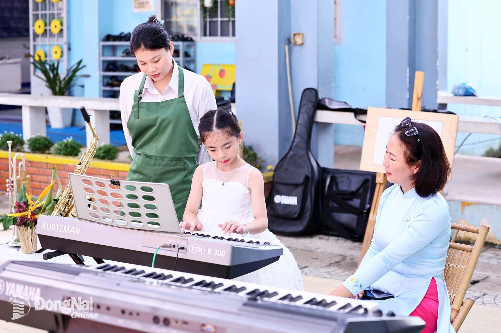 Elevene viser selvsikkert frem orgelspilltalentet sitt midt på skolegården. Foto: Cong Nghia |