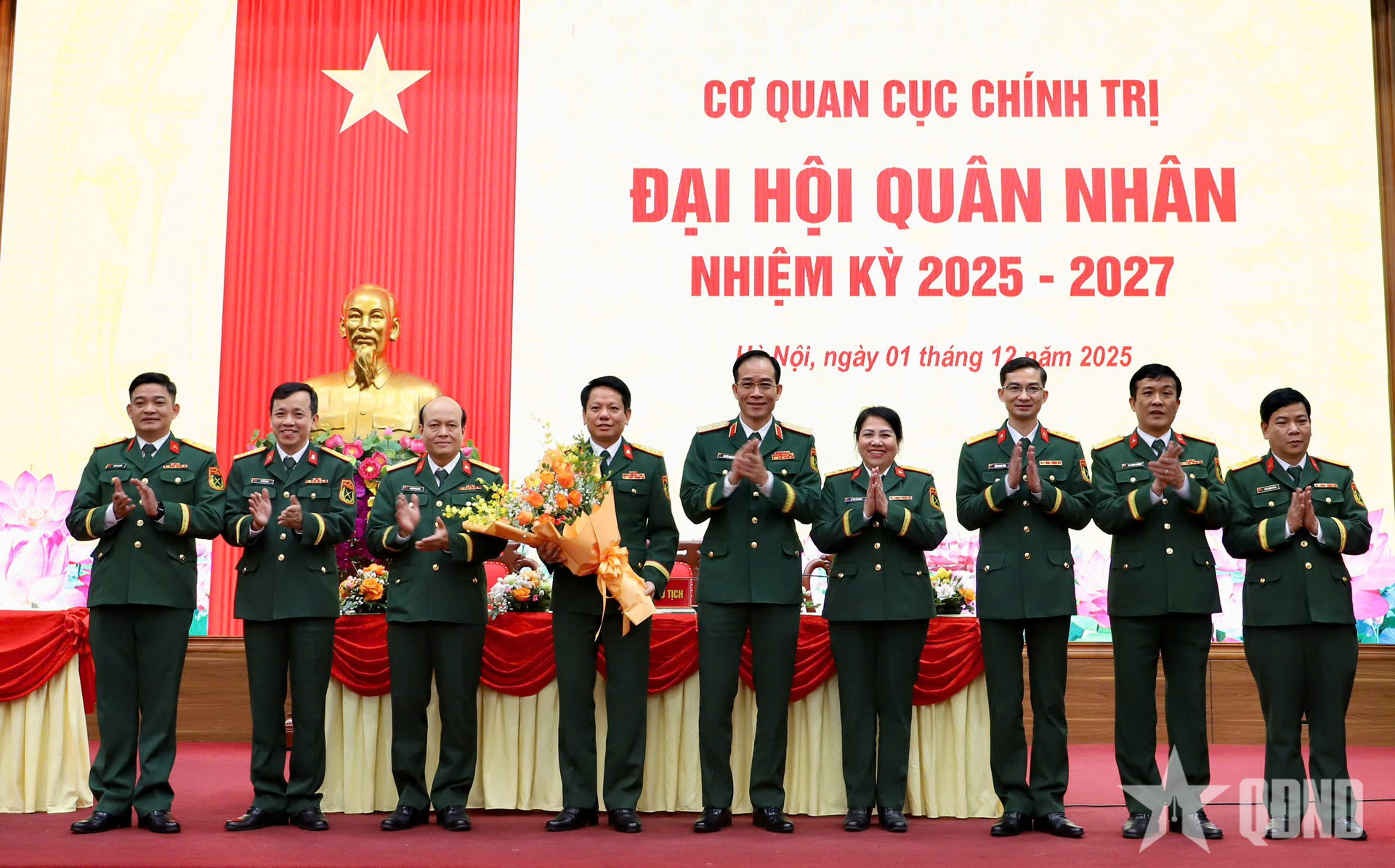 Generalmajor Nguyen Manh Hung, direktør for den politiske avdelingen, generalavdelingen for logistikk og teknologi, overrakte blomster for å gratulere Militærrådet for perioden 2025–2027. |