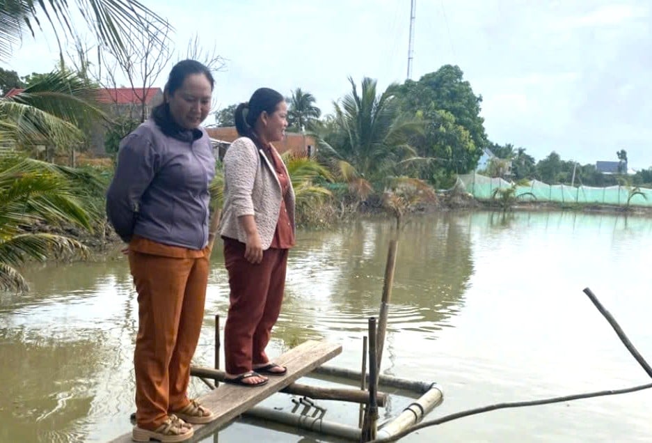 Fru Binh (til høyre) besøker modellen for slangehodefiskeoppdrett til fru Nguyen Thi Diems familie.