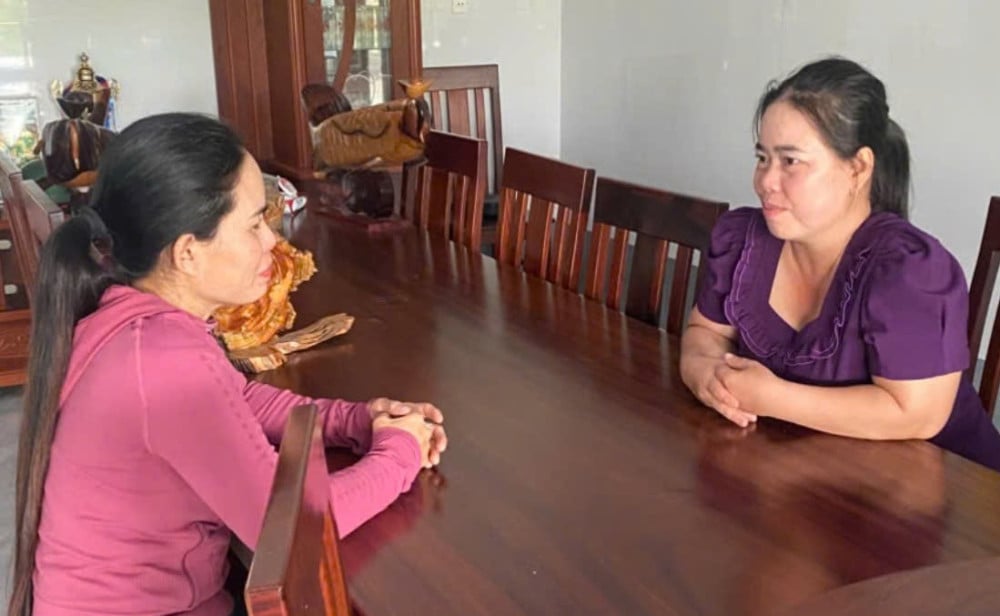 Fru Nguyen Thi Binh (til høyre) diskuterer effektiviteten av å bruke studielån hjemme hos fru Nguyen Thi Thanh Mai.