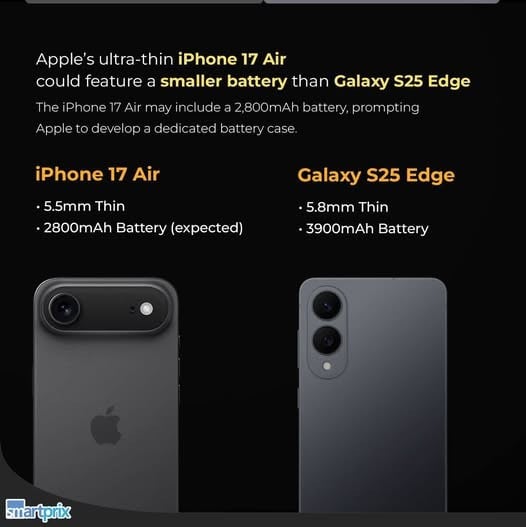 Det er imidlertid verdt å merke seg at den 5,8 mm tykke Galaxy S25 Edge bare har et beskjedent batteri på 3900 mAh, mens den nylig lanserte Apple iPhone Air har et batteri på 3149 mAh. Begge telefonene ble lansert for å ta igjen trenden med ultratynne enheter. Galaxy S25 Edge er bare 5,8 mm tykk, mens iPhone Air er enda tynnere med sine 5,6 mm.
