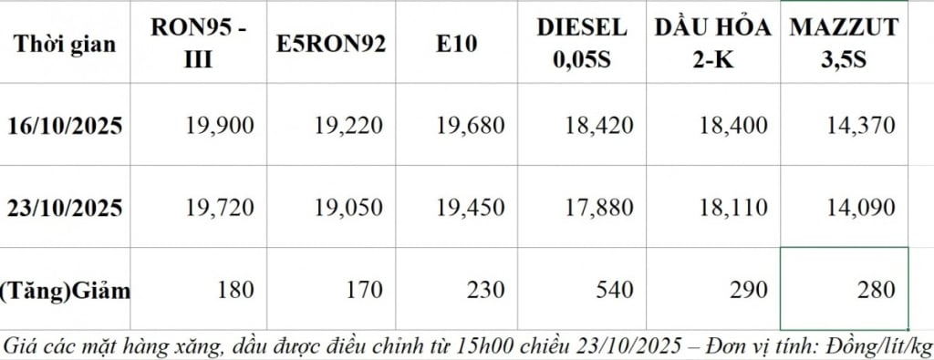 Bensinprisen E5RON92 falt med 170 VND/liter fra klokken 15.00 i ettermiddag, 23. oktober; RON95-III bensin falt med 180 VND/liter; E10 bensin falt med 230 VND/liter; dieselprisen falt med 540 VND/liter, parafin falt med 290 VND/liter/kg, og mazut-olje falt med 280 VND/liter/kg sammenlignet med justeringsperioden 16. oktober.
