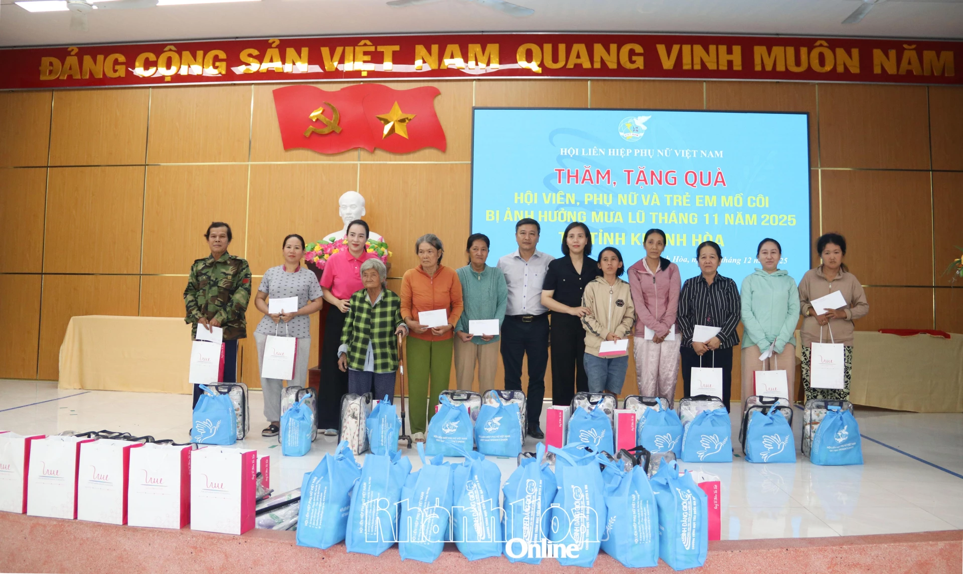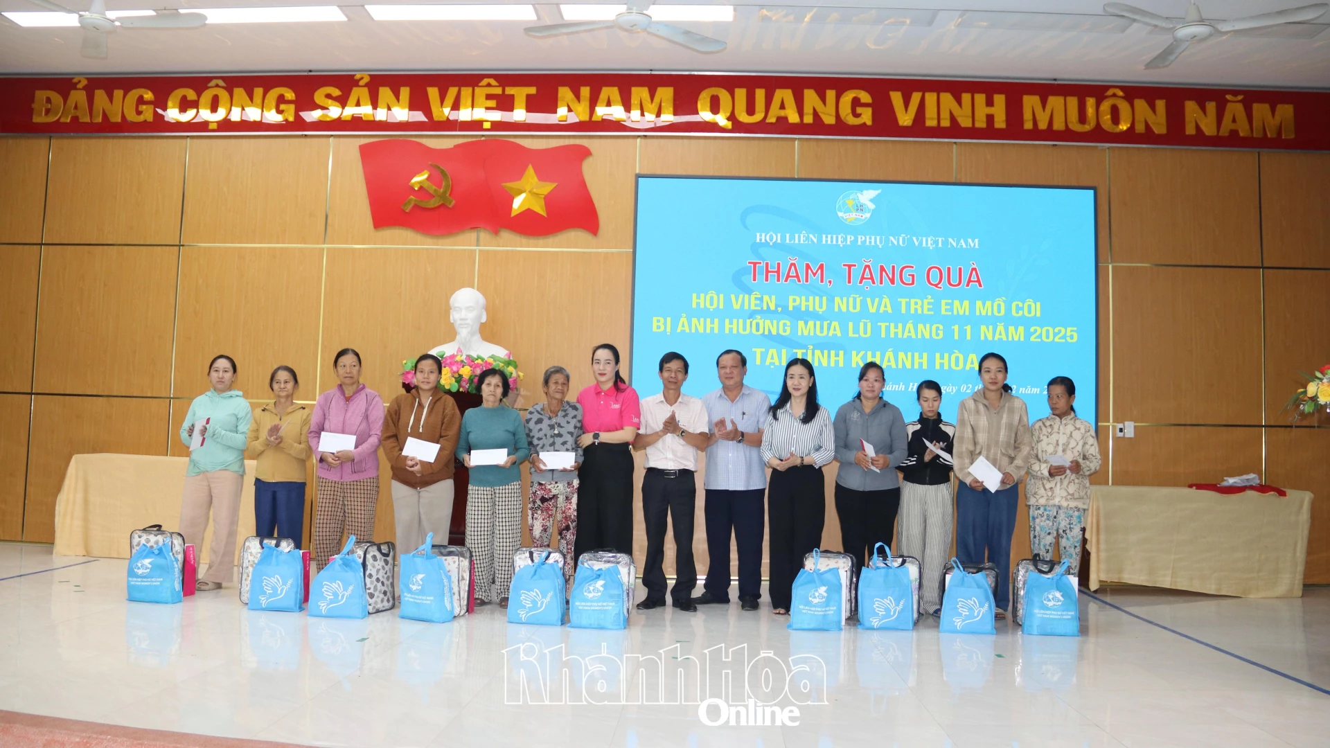 Delegasjonen overrakte derfor 40 gaver, hver verdt 1 million VND i kontanter og nødvendighetsartikler til 40 familier med medlemmer og kvinner i vanskelige kår som er rammet av flom i de to bydelene. Arbeidsdelegasjonen fra Vietnams kvinneunion, Khanh Hoa provinsielle kvinneunion og Bac Nha Trang-bydelen besøkte også og overrakte to gaver, hver verdt 2 millioner VND i kontanter og gaver til familier med medlemmer og foreldreløse barn som led store tap på grunn av flom i Bac Nha Trang-bydelen. Den totale verdien av gavene var over 65 millioner VND.