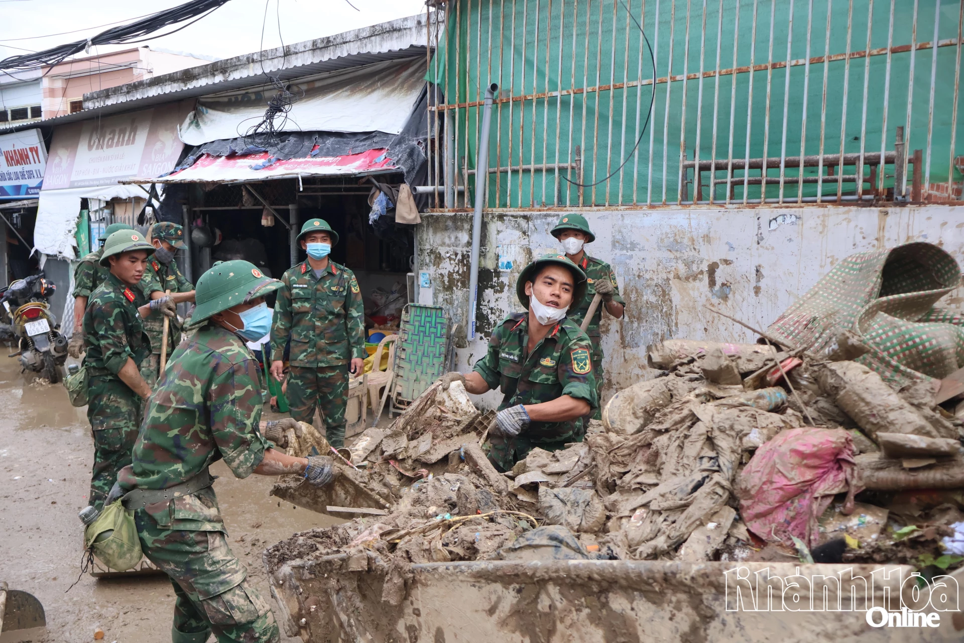 | Hæren samler søppel i et boligområde i Tay Nha Trang-distriktet. |
