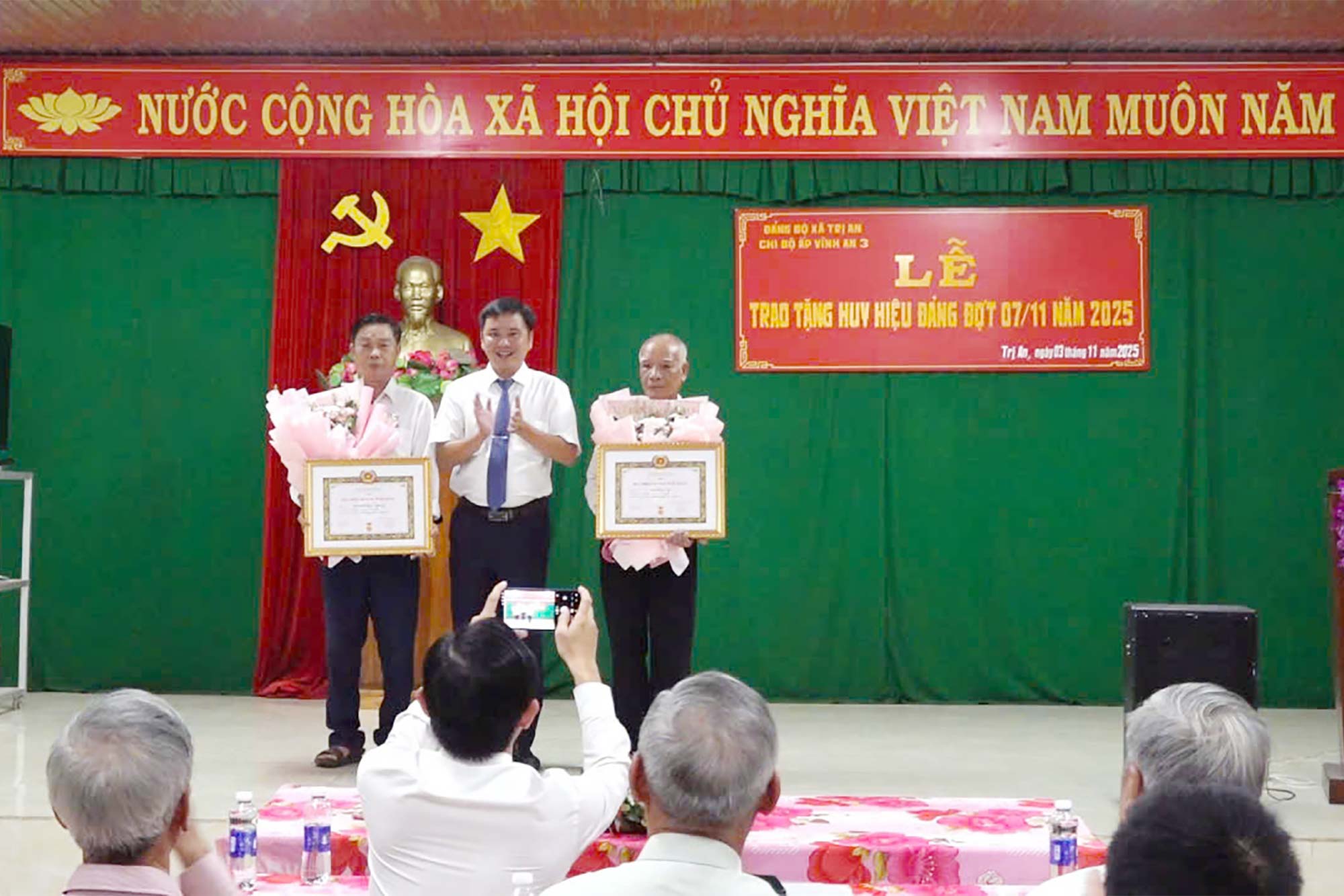 Kvelden 3. november arrangerte partikomiteen i Tri An kommune en utdelingsseremoni for partimerker for partimedlemmer med 30, 40 og 45 års partimedlemskap i Vinh An 2, 3 og 8 landsbyer.