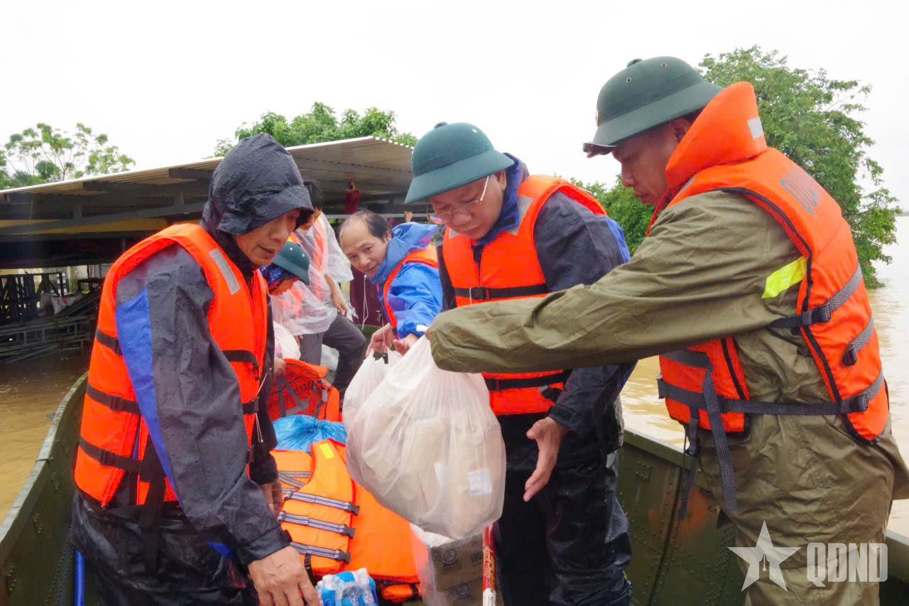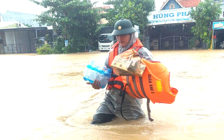 På flomtoppen i Hoi An, Cua Dai, Dien Ban, Hoa Xuan, Hoa Tien (Da Nang); Son Tay Thuong, Ba Vinh, Tay Tra Bong, Son Linh, Dak Plo ( Quang Ngai ); i tråd med generalløytnant Le Ngoc Hais, kommandør for militærregion 5, har soldater og militsstyrker de siste tre dagene, til tross for kraftig regn og stigende flomvann, transportert dusinvis av tonn tørrmat, instantnudler, brød og medisiner til folket.