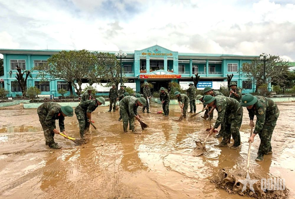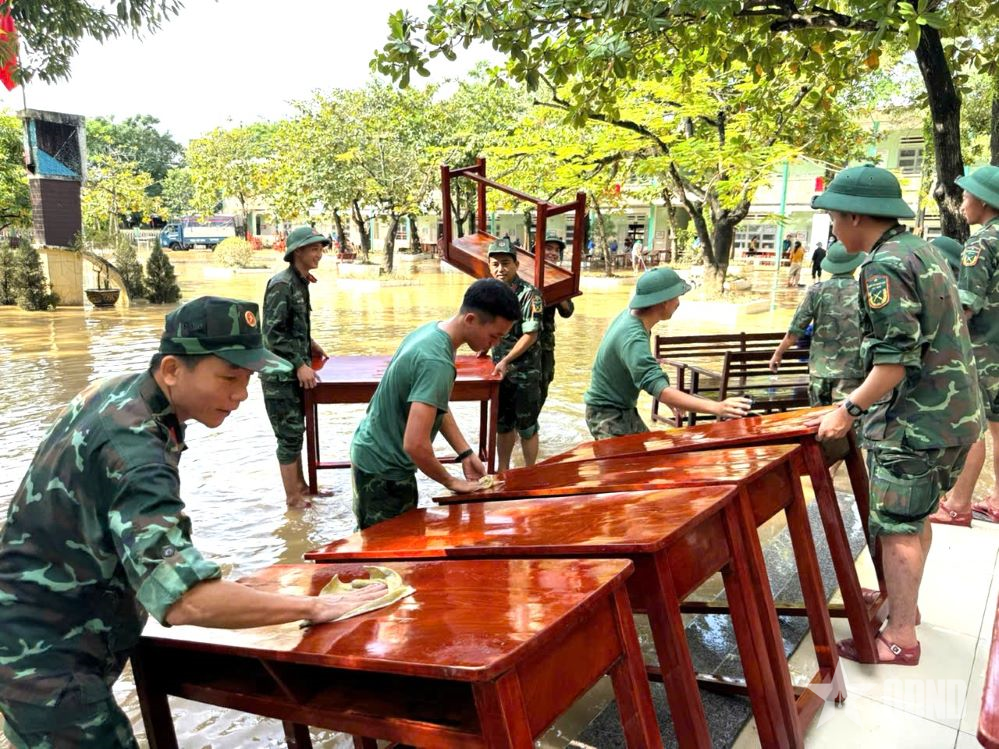 På Tran Quoc Tuan videregående skole (Hoa Vang, Da Nang ) har vannet trukket seg mye tilbake, men det er fortsatt knedypt. Etter nesten fire timer med travelt og presserende arbeid samlet soldatene nesten 200 m3 med gjørme, feide og rengjorde alle 26 klasserom, aktivitetsrom, spiseområder, kjøkken og lekeplasser i første etasje. Bord, stoler, arkivskap og dokumenter som lærerne hadde brakt til andre og tredje etasje for å unngå flommen siden forrige helg, ble også båret ned av soldatene og arrangert pent slik de var i begynnelsen.