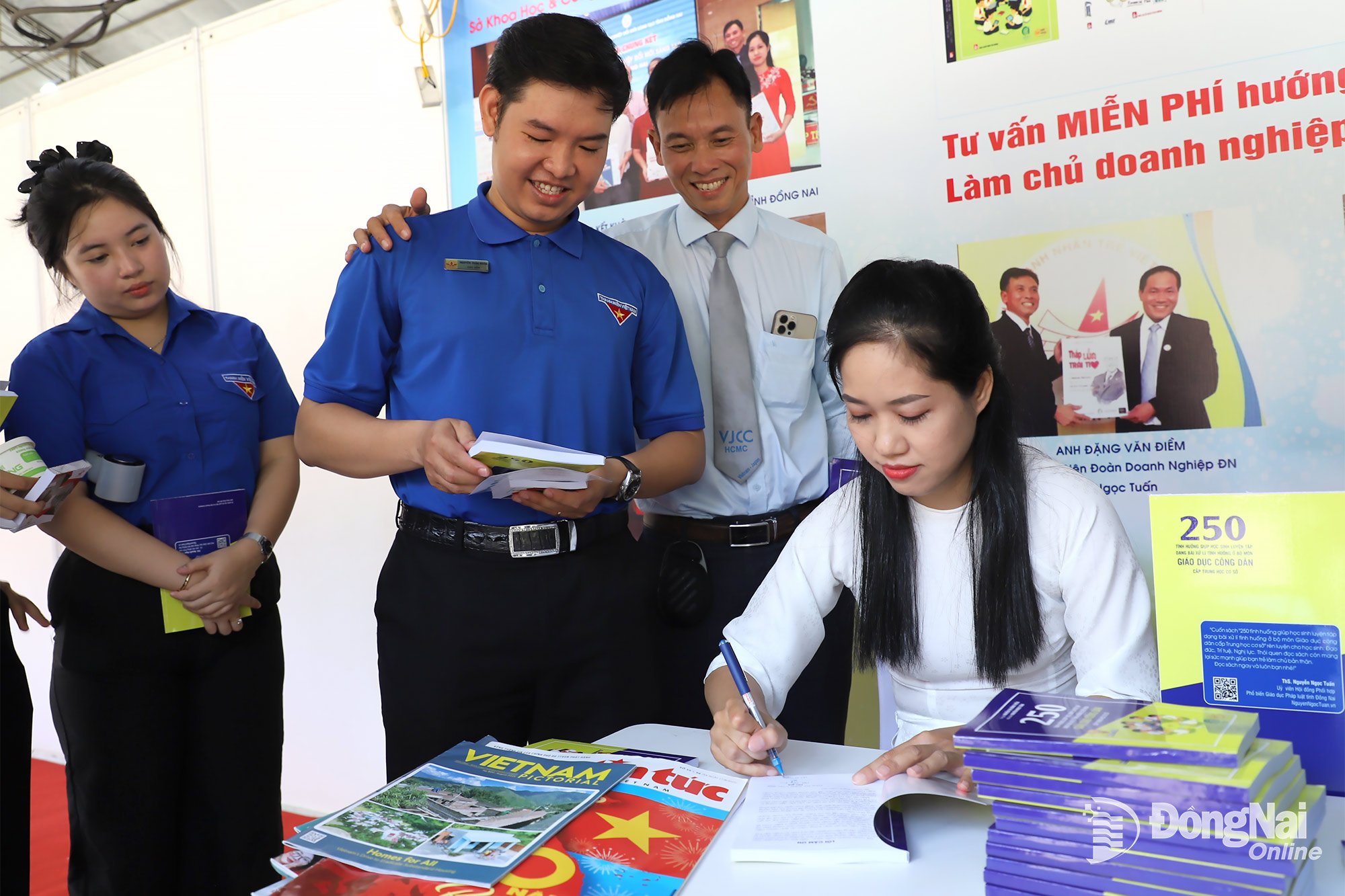 | Fru Nguyen Thi Hong Tuyen, lærer ved Tran Hung Dao videregående skole (Tran Bien-distriktet), signerte bøker for fagforeningsmedlemmer og ungdom i provinsen. Foto: My Ny |