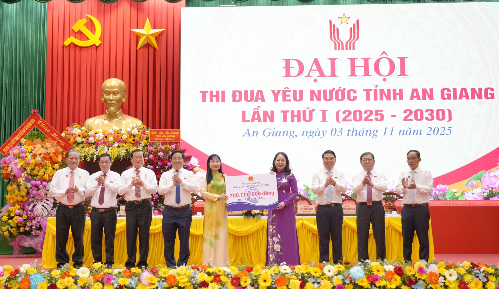 Under seremonien overrakte visepresident Vo Thi Anh Xuan 200 millioner VND fra Vietnams barnefond til An Giang-provinsen og gaver til vietnamesiske heroiske mødre og helter fra folkets væpnede styrker.
