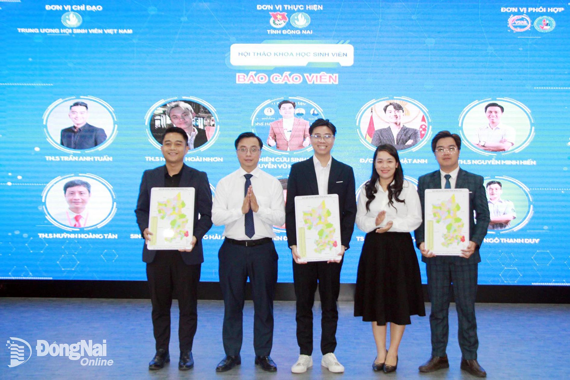 | Representanter fra sentralkomiteen i Vietnams studentforening og Dong Nai provinsielle studentforening overrakte suvenirer til foredragsholderne på konferansen. Foto: Nga Son |