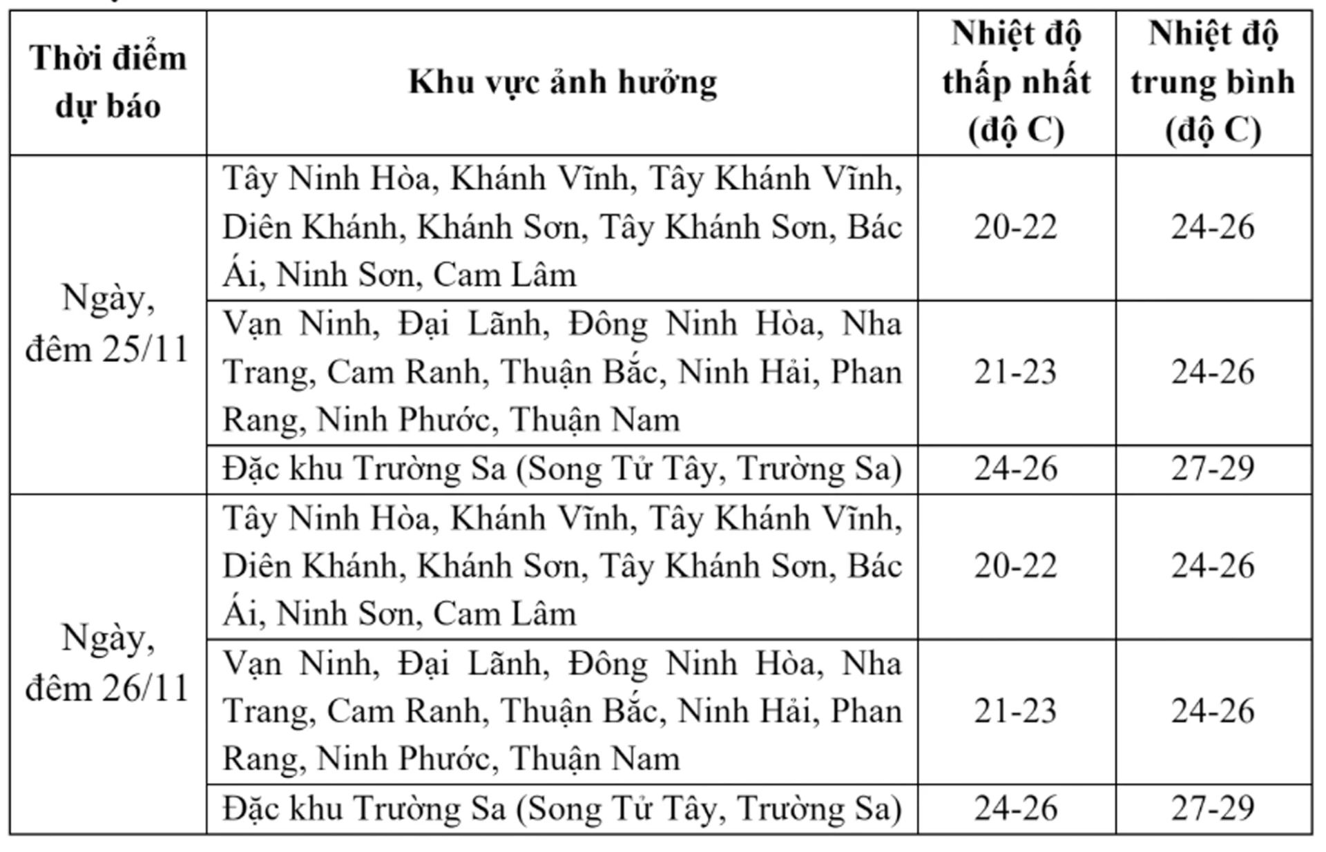 Det er meldt at den kalde luftmassen vil påvirke været i Khanh Hoa-provinsen 25. og 26. november, så det vil bli spredte byger, hovedsakelig i kystområdene. Nordøstlig vind på land er nivå 4, nivå 5; kystområdene noen ganger nivå 6, med vindkast opp til nivå 7-8. Den laveste temperaturen under denne kalde luftmassen i Khanh Hoa er vanligvis fra 21-23 grader Celsius, i fjellområder fra 20-22 grader Celsius; kaldt om natten og om morgenen (detaljer i tabellen).