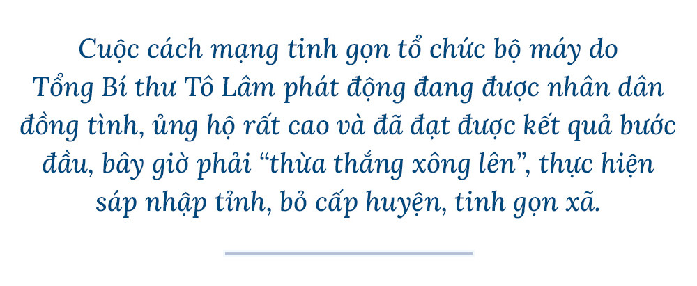 Politikken med å omorganisere administrative enheter på alle nivåer denne gangen er rettet mot et stort mål, med en hundreårig strategisk visjon. Generalsekretær To Lam understreket: Omorganiseringen av administrative enheter på alle nivåer denne gangen «handler ikke bare om å justere administrative grenser, men også om å justere økonomisk rom; justere arbeidsdelingen, desentralisering, justere fordelingen og kombinasjonen av økonomiske ressurser».