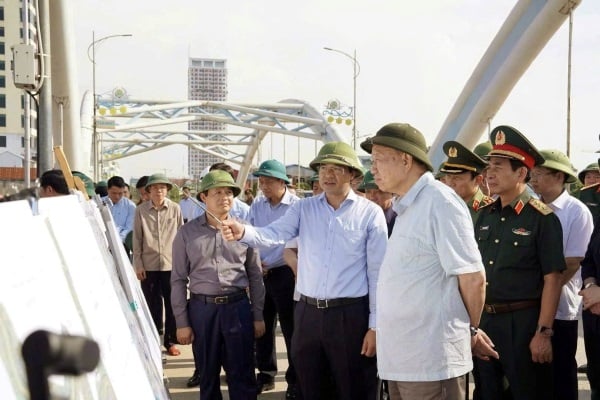 På stedet ved Ben Tuong-broen (Phan Dinh Phung-distriktet) – et av nøkkelområdene for flomforebygging og -kontroll i provinsen – inspiserte generalsekretær To Lam de to breddene av Cau-elven direkte. Han lyttet til sekretæren i den provinsielle partikomiteen, Trinh Xuan Truong, som presenterte flomkartet nedstrøms Cau-elven, rapporterte om arbeidet med å overvinne konsekvensene av storm nr. 11 og planen om å bygge et system med dikearbeid, flomforebygging og -kontroll på begge breddene av Cau-elven gjennom sentrum av Thai Nguyen-provinsen.