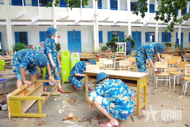 Tidligere, om morgenen den 22. november, ble nesten 200 kadrer, elever, soldater og mange spesialkjøretøy fra skolen, som bulldosere, gravemaskiner, brannbiler, høytrykkspumper, ambulanser og 500 måltidsbiler, mobilisert til områder som ble hardt skadet, inkludert: Phu An Nam landsby (Dien Khanh kommune); Green Star barnehage (Vinh Diem Trung urbane område); Ngoc Hiep barneskole og Ngoc Hiep videregående skole (Tay Nha Trang bydel). Her koordinerte skolens soldater med lokale myndigheter for å rydde opp i gjørme og jord, rengjøre klasserom, rydde dreneringssystemer, støtte flytting av eiendeler og tilby helsetjenester til folk.
