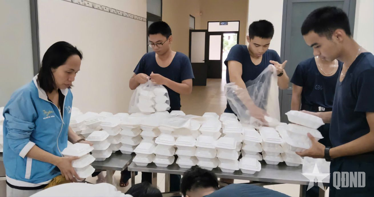 Skolen var ikke bare direkte til stede på åstedet, men koordinerte også den 22. november med avdelingen for propaganda og massemobilisering i Khanh Hoa provinsielle partikomité for å lage mer enn 700 måltider på kjøkkenet i hovedkvarteret og kjøkkenet til bataljon 1 for å sende til folk i de flomrammede områdene.