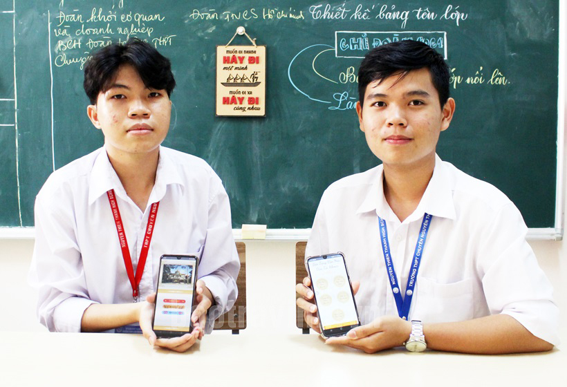 Nguyễn Anh Bảo (phải) và Hồ Việt Thuận Phú giới thiệu giao diện “Phần mềm Bảo tàng Văn hóa dân tộc Khmer” của 02 em trên ứng dụng điện thoại di động.