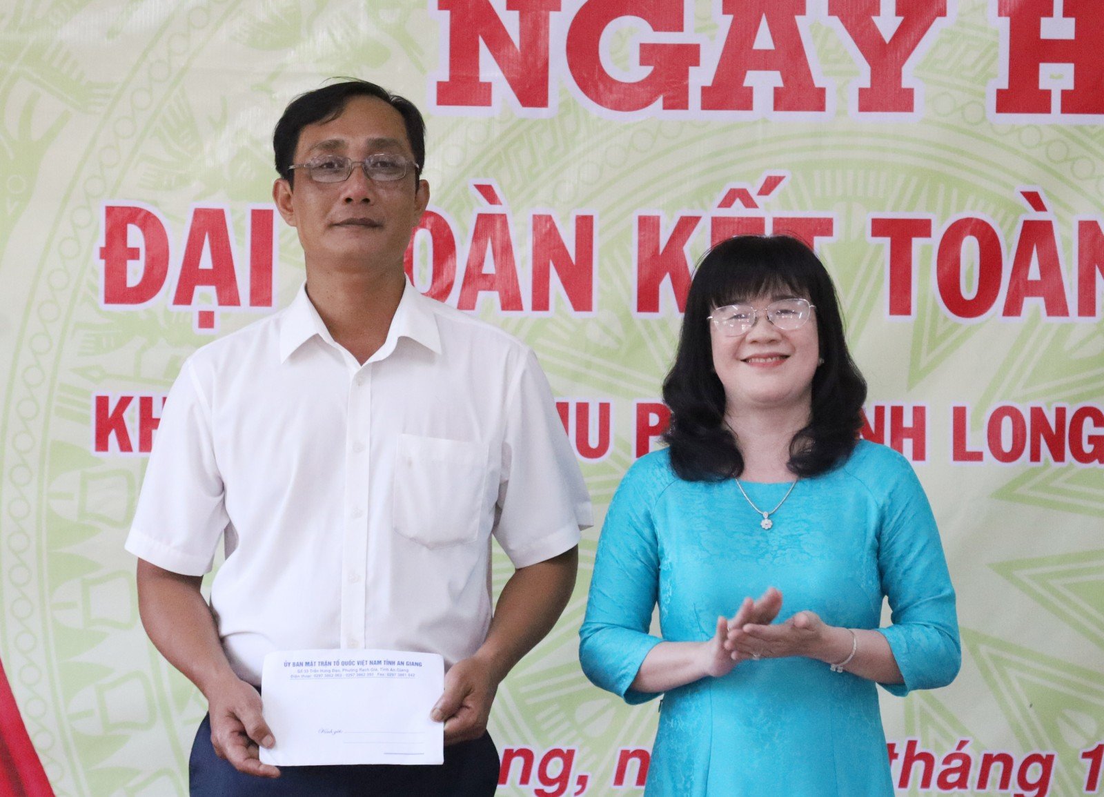 Phó Chủ tịch Ủy ban MTTQ Việt Nam tỉnh An Giang Hà Minh Trang (bên phải) trao hỗ trợ kinh phí tổ chức ngày hội cho Ban Công tác Mặt trận khu phố Minh Long.
