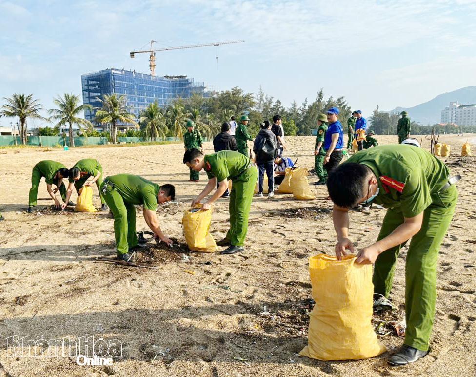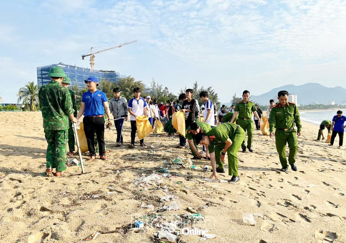 | Các lực lượng phường Ninh Chử ra quân vệ sinh môi trường bờ biển. |