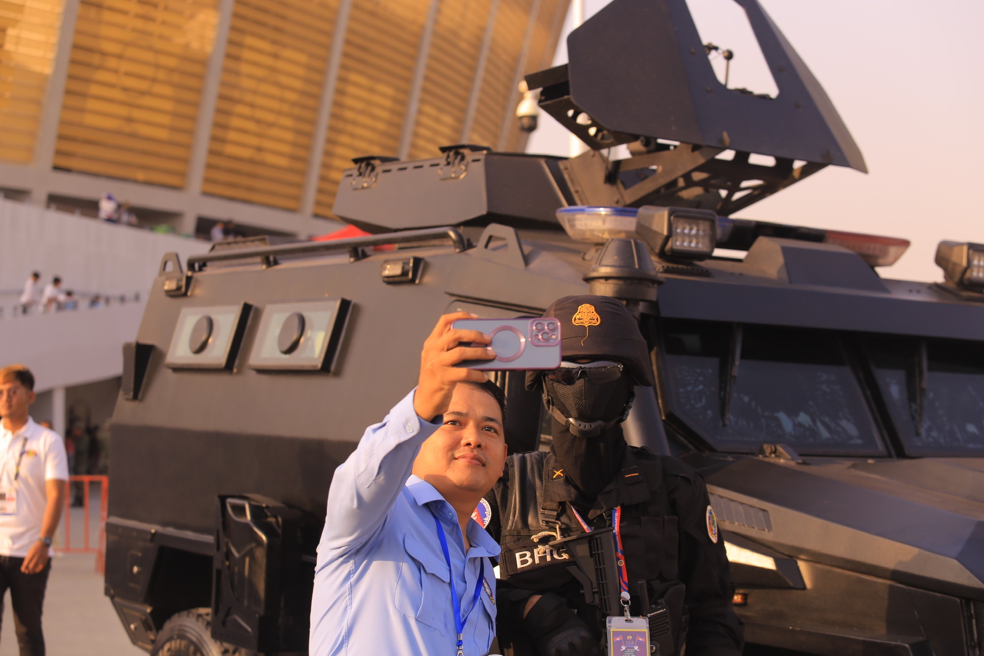 Vì lễ khai mạc là sự kiện rất quan trọng, trong khi có hàng chục ngàn người đến trực tiếp sân để xem nên Campuchia phải điều động lực lượng quân sự hùng hậu để đảm bảo công tác an ninh, an toàn. Bên cạnh con người, nhiều phương tiện quân sự hiện đại cũng xuất hiện tại sân Morodok Techo ở lễ khai mạc SEA Games 32.