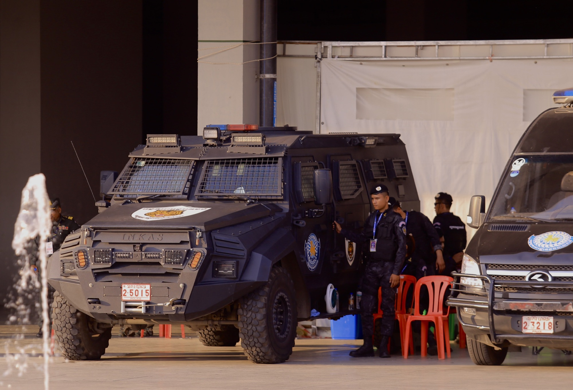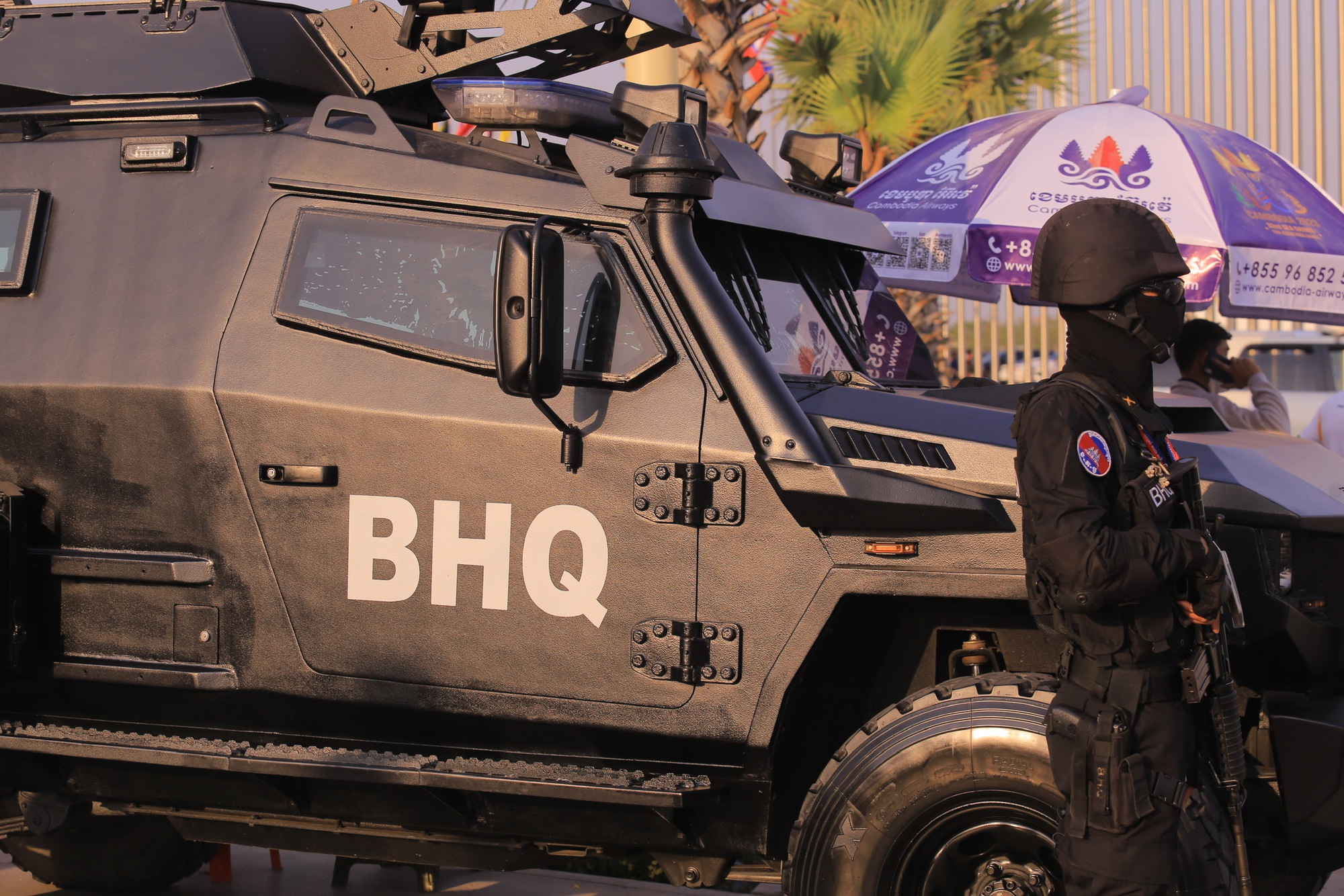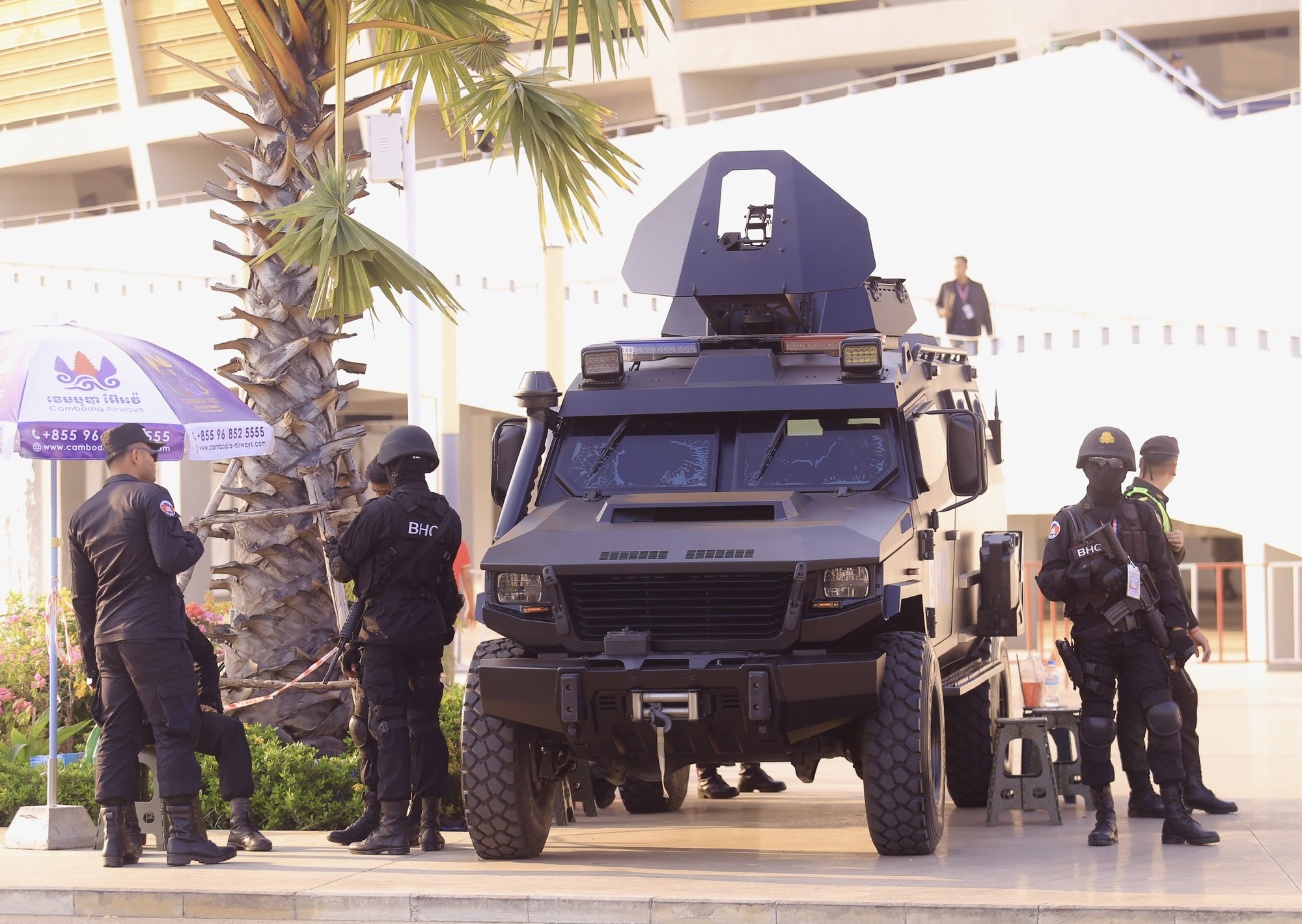 Nhiều xe bọc thép xuất hiện ở khu vực lối vào chính của sân Morodok Techo
