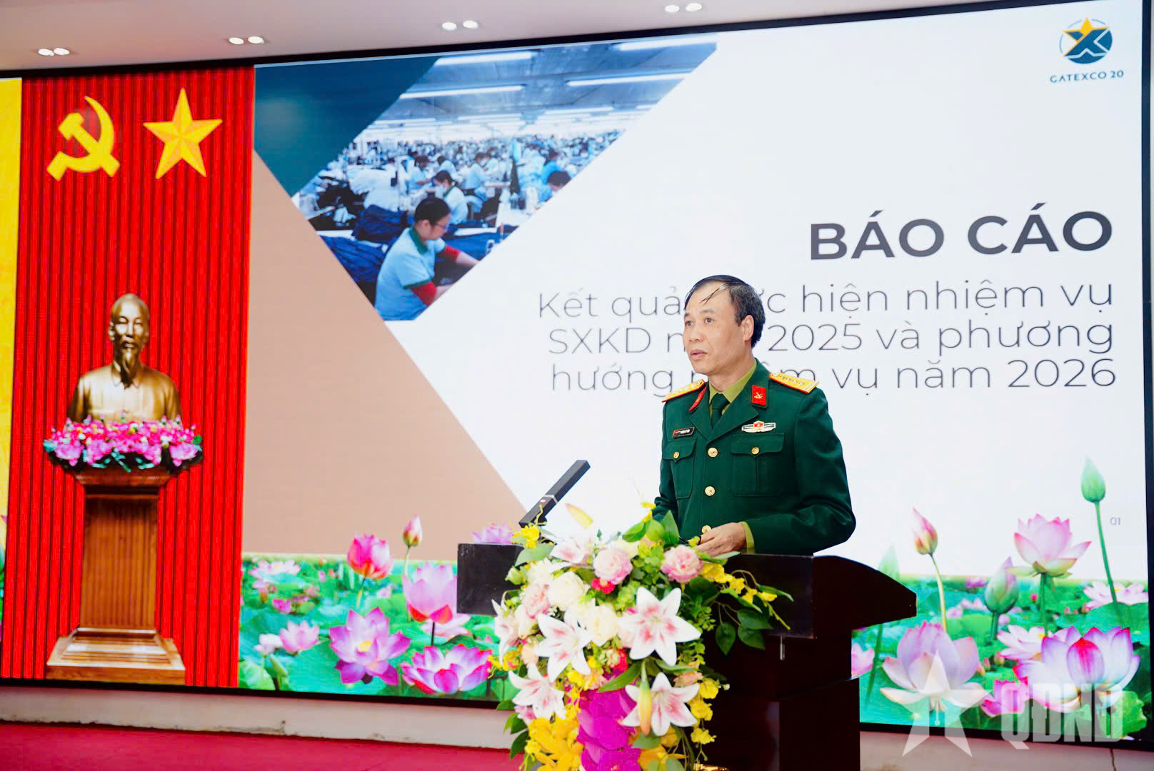 | Pułkownik Hoang Sy Tam, zastępca sekretarza komitetu partyjnego i dyrektor generalny X20 Joint Stock Company, przedstawił raport na temat wyników produkcyjnych i biznesowych w roku 2025. |