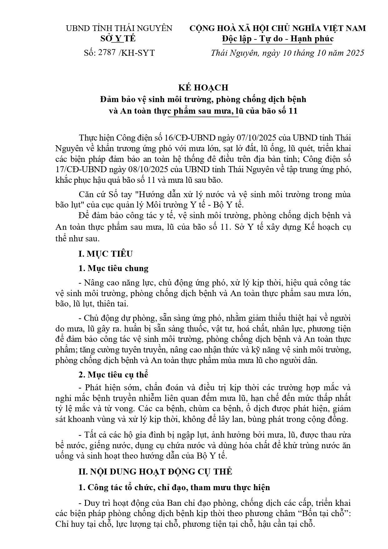 Aby zwiększyć przepustowość, proaktywnie reagować, szybko i skutecznie zarządzać higieną środowiska, zapobiegać chorobom i zapewniać bezpieczeństwo żywności po powodziach, Ministerstwo Zdrowia wydało Plan nr 2787/KH-SYT w sprawie zapewnienia higieny środowiska, zapobiegania chorobom i bezpieczeństwa żywności po powodziach spowodowanych przez sztorm nr 11. Jego treść jest następująca: