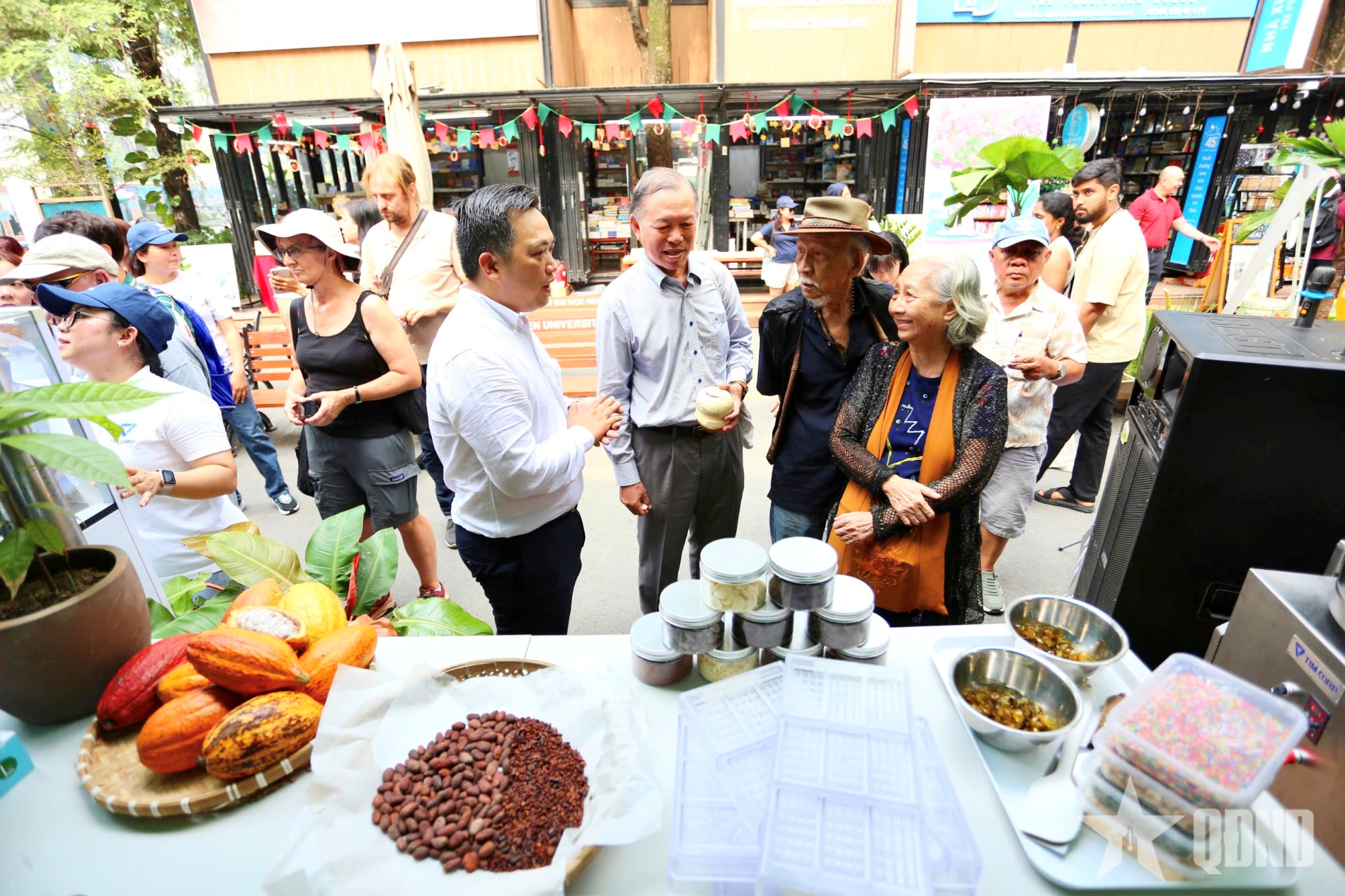 | Goście odwiedzili stoisko produkujące czekoladę z ziaren kakaowca w delcie Mekongu. |