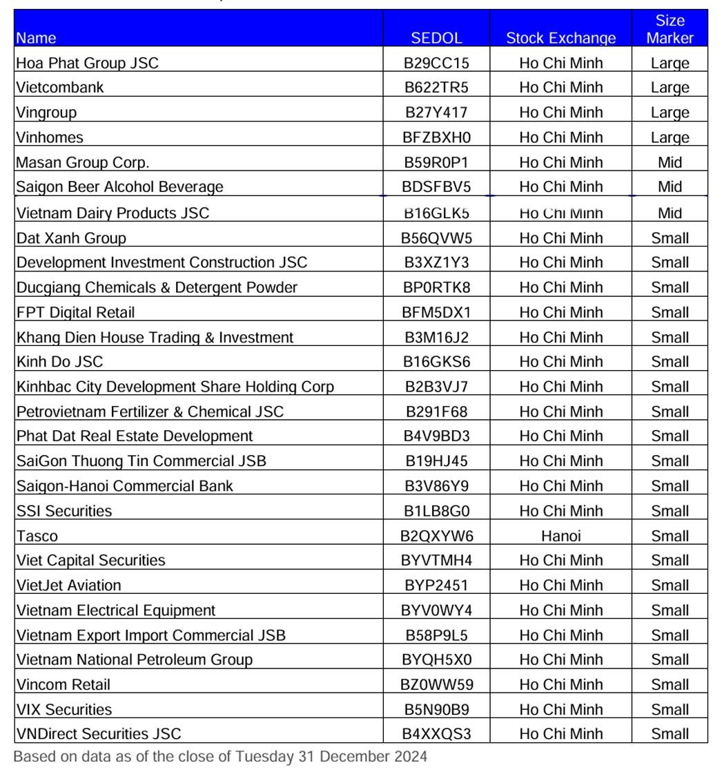 W niniejszym ogłoszeniu FTSE opublikowała listę wietnamskich akcji, które spełniają kryteria selekcji FTSE Global All Cap, w oparciu o dane z dnia zamknięcia sesji 31 grudnia 2024 r. Oficjalna lista zostanie opublikowana przed przeglądem we wrześniu 2026 r.