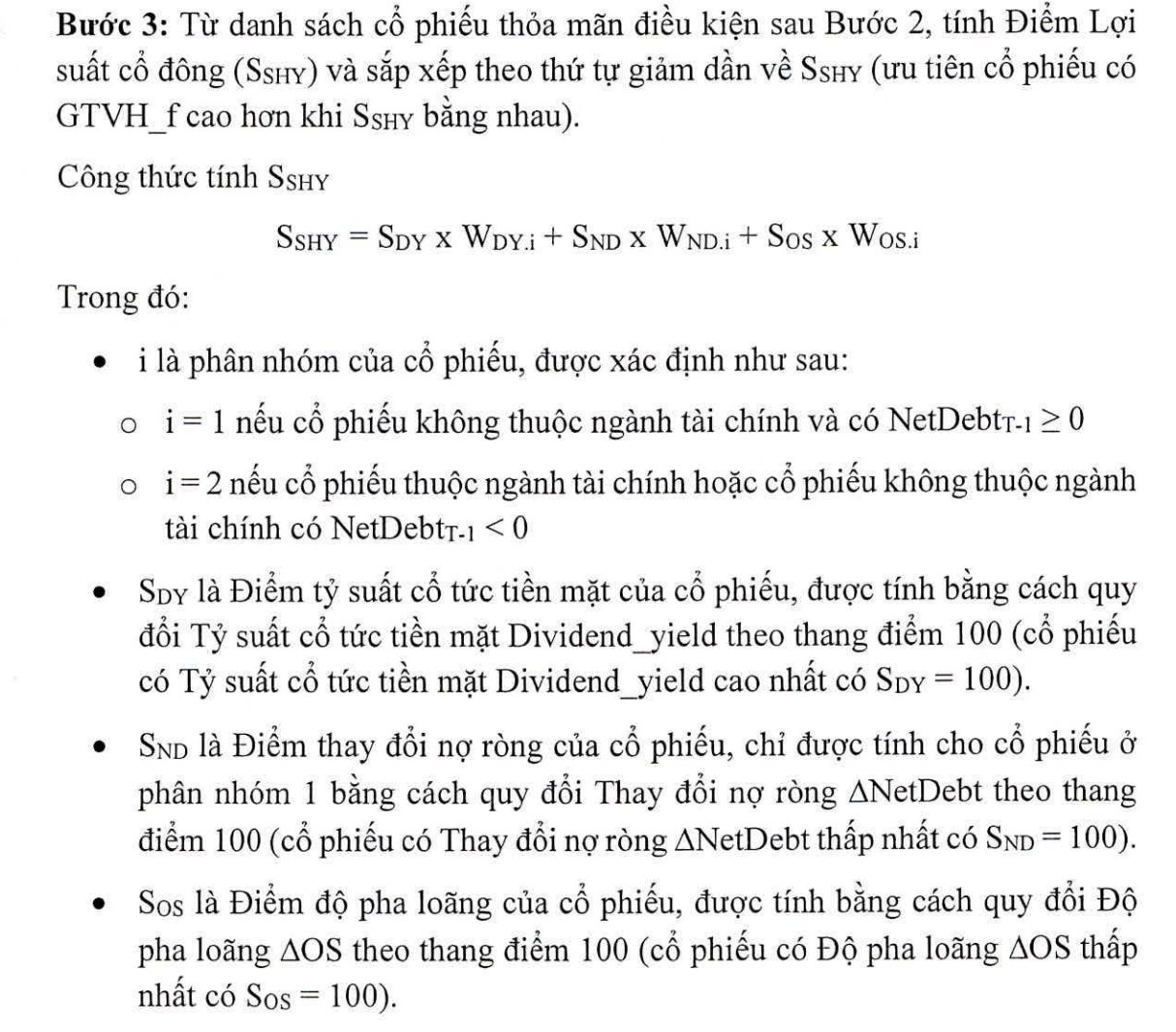Z listy spełniającej powyższe warunki wybierz kody akcji, które wypłacały dywidendy pieniężne nieprzerwanie przez 3 kolejne lata przed rokiem analizy, a następnie oblicz wskaźnik rentowności akcji (SW) i uporządkuj je w kolejności. Wskaźnik rentowności akcji zostanie obliczony na podstawie wskaźnika rentowności akcji, wskaźnika zmiany długu netto oraz wskaźnika rozwodnienia akcji, zgodnie z zasadami HoSE, aby wybrać akcje spełniające warunki.