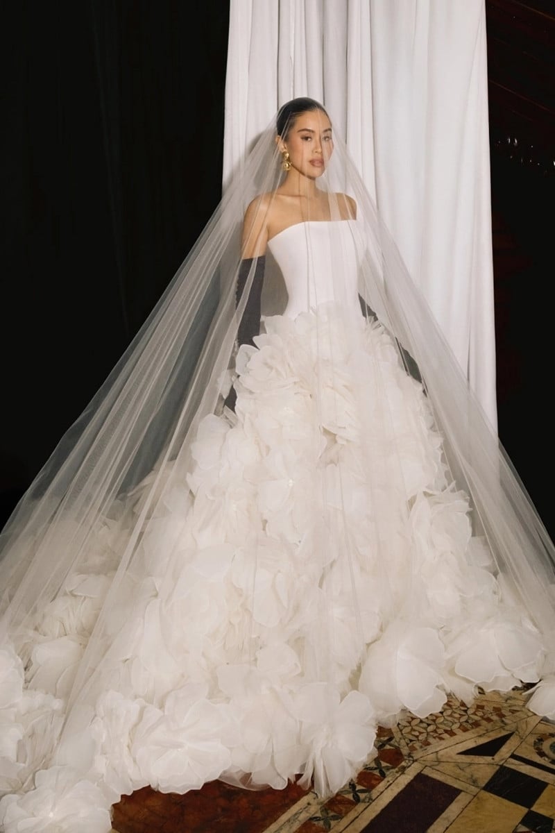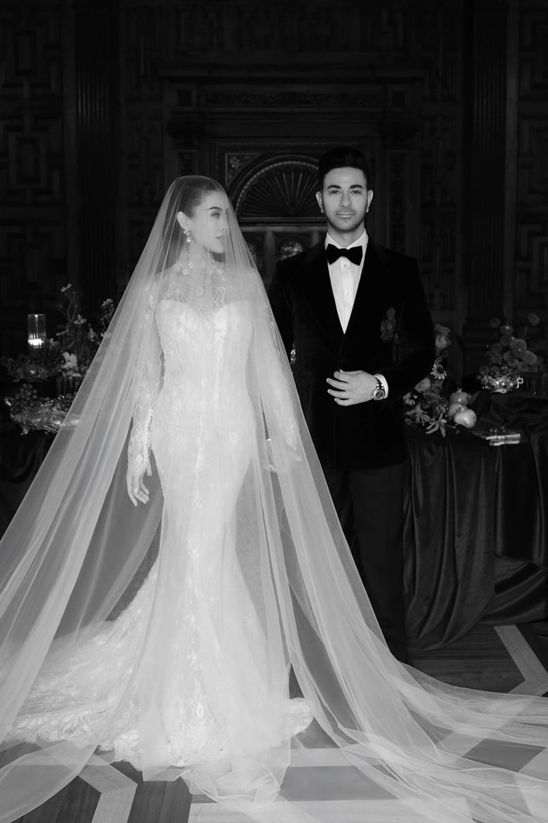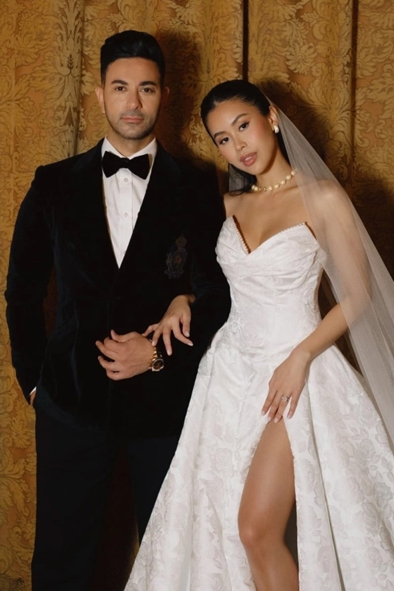 Tien Nguyen miała na sobie wiele projektów Nicole Felicia Couture, Berty i Pallas Couture Privée – od obcisłych koronek po seksowne sukienki bez ramiączek. Uwagę przykuła kwiecista suknia w połączeniu z długim welonem, tworząc romantyczny, elegancki look. Pan młody Justin Cohen prezentował się elegancko w czarnym smokingu Dolce&Gabbana.