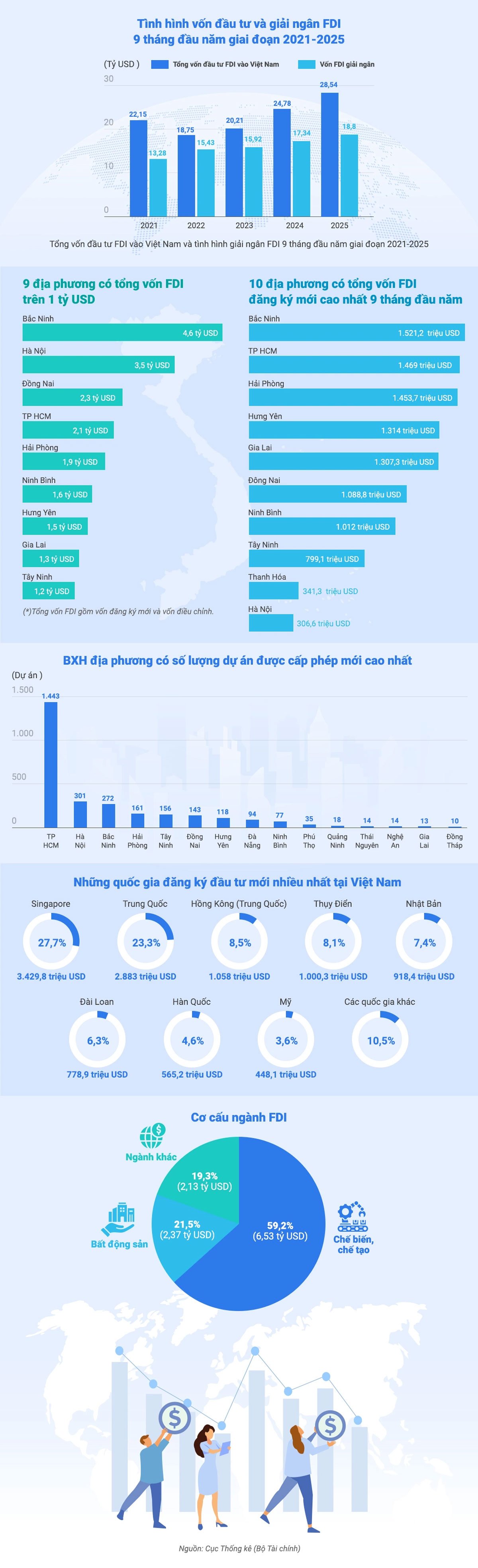 Nos primeiros nove meses do ano, o país registrou 28,54 bilhões de dólares em investimento estrangeiro direto (IED), um aumento de 15,2%, com Bac Ninh liderando, seguido por Ho Chi Minh, Hai Phong, Hung Yen e Gia Lai.
