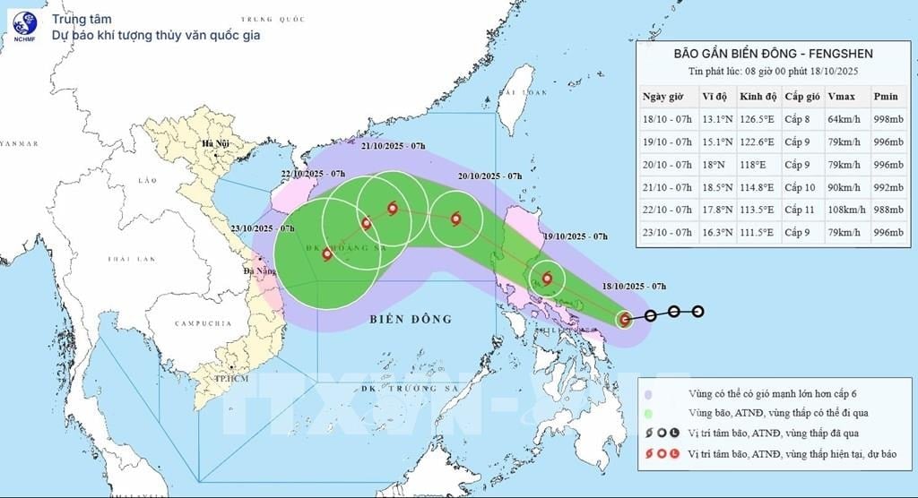 A previsão é de que por volta da manhã de 19 de outubro, a tempestade Fengshen atinja a região da Ilha de Luzon (Filipinas). Na tarde e noite de 19 de outubro, a tempestade Fengshen passará pela Ilha de Luzon (Filipinas) e entrará no Mar do Leste, tornando-se a tempestade número 12. Após entrar no Mar do Leste, a tempestade número 12 se moverá principalmente na direção oeste-noroeste, e sua intensidade continuará a aumentar. Por volta de 22 de outubro, quando a tempestade se deslocar para a região norte da zona especial de Hoang Sa, a intensidade da tempestade número 12 aumentará para o nível 11, com rajadas para o nível 13.