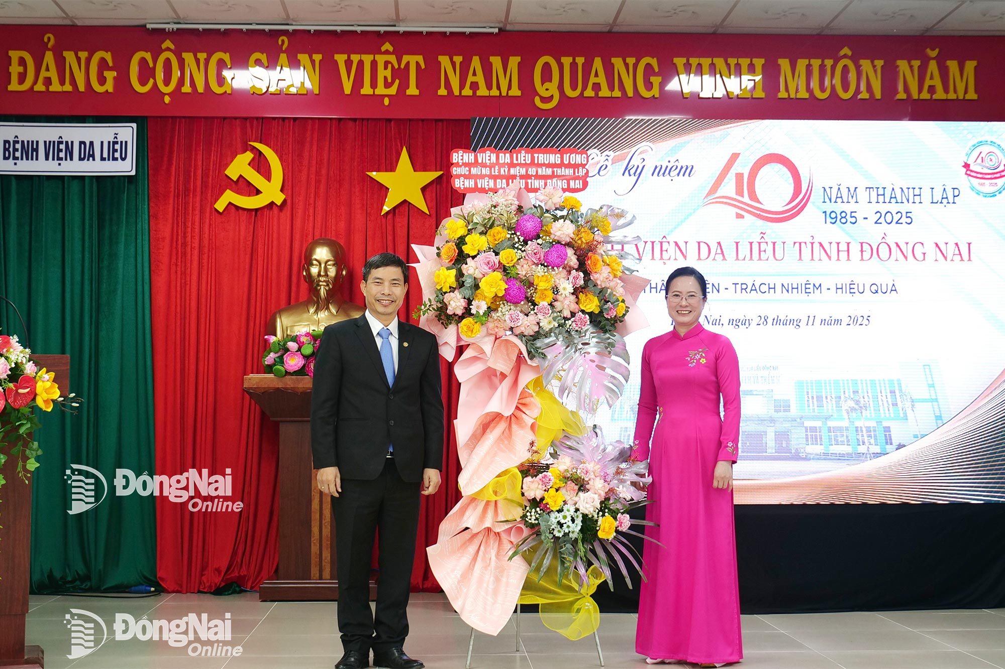 A diretora do Departamento de Saúde da Província de Dong Nai, Do Thi Nguyen, entregou flores em sinal de felicitação ao Hospital de Dermatologia de Dong Nai. Foto: Hanh Dung |