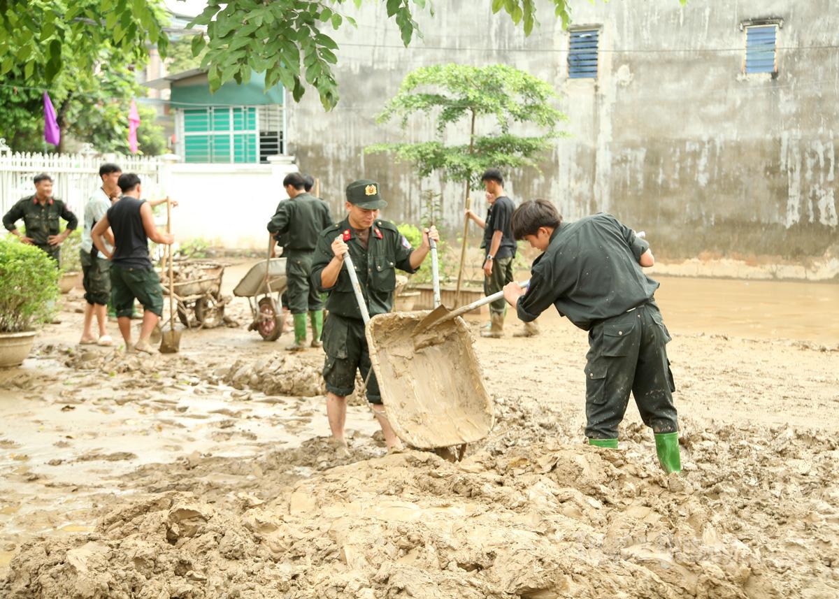 A Força Policial Móvel e a Polícia Provincial apoiaram a Escola Secundária Quang Trung, no bairro de Ha Giang 2, para limpar a lama. |